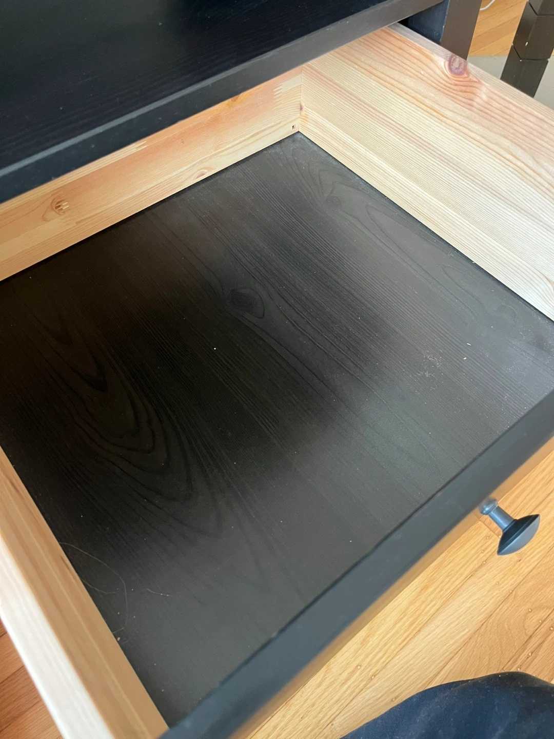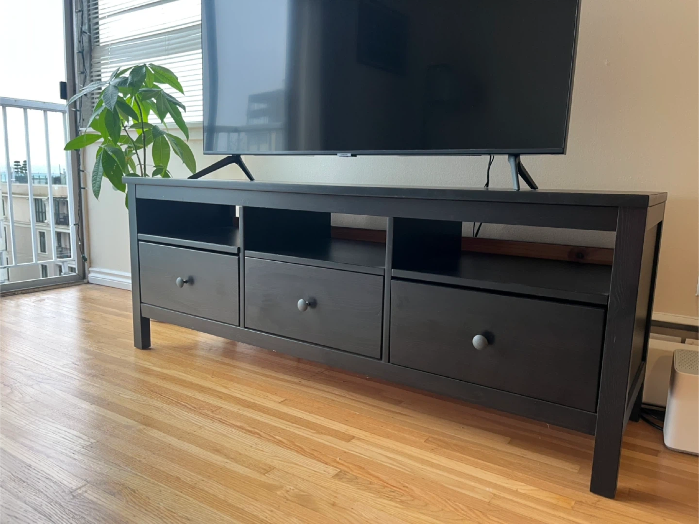 Dark brown (almost black) TV stand with three drawers and open shelving. This unit provides ample storage for electronics and media. It's a practical piece for any living room setup. It's made of particleboard and fibreboard.