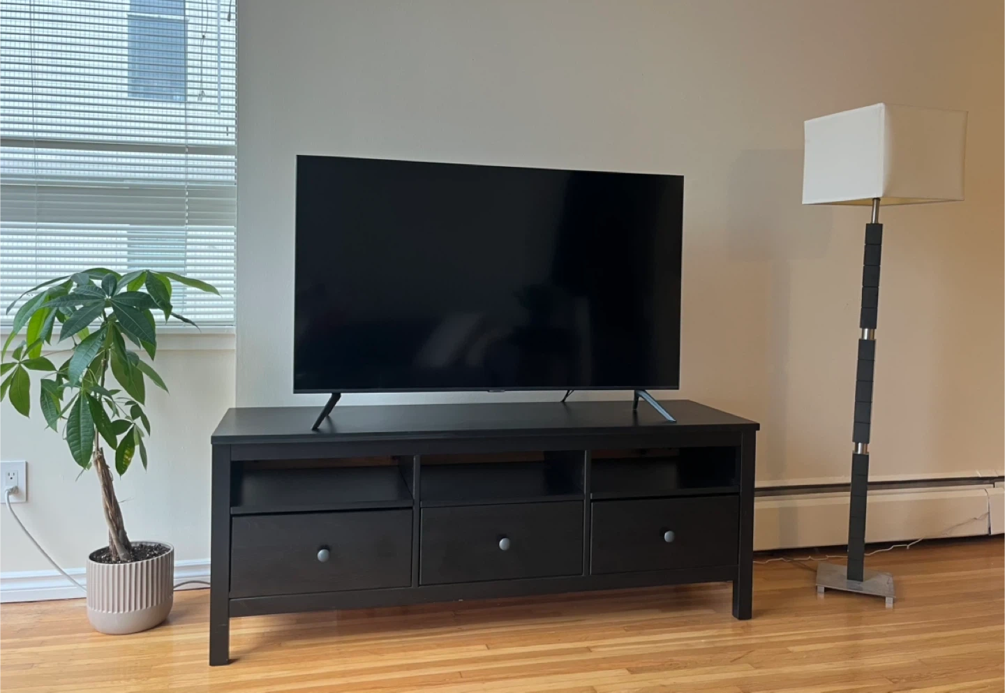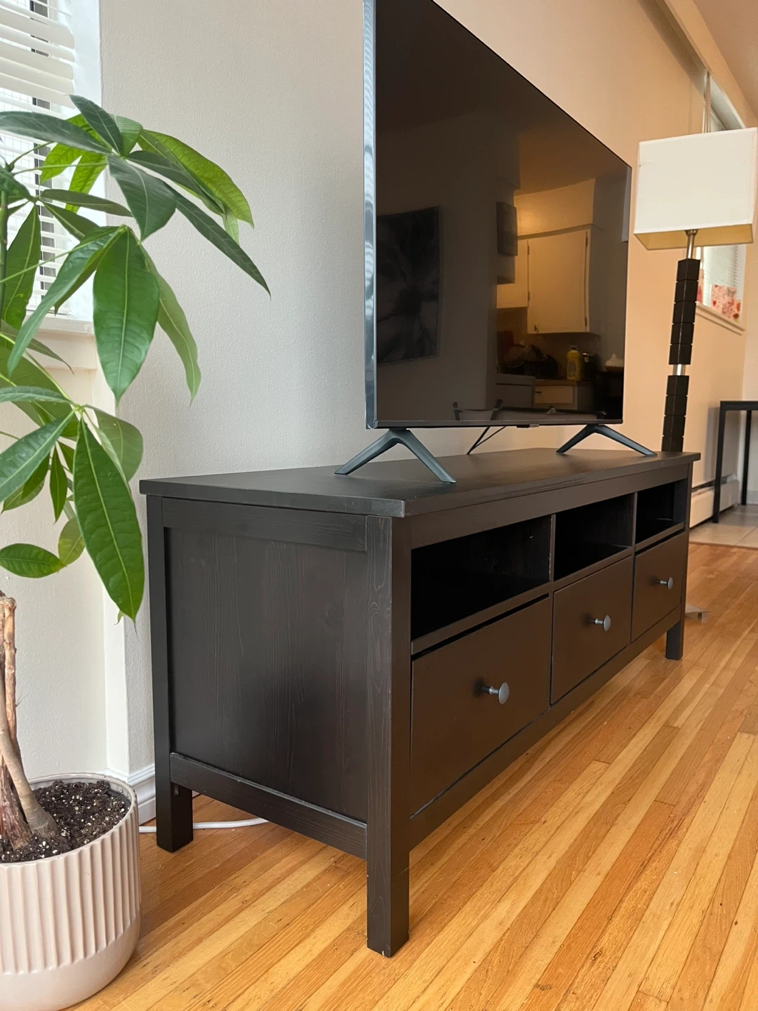 Dark brown (almost black) TV stand with three drawers and open shelving. This unit provides ample storage for electronics and media. It's a practical piece for any living room setup. It's made of particleboard and fibreboard.