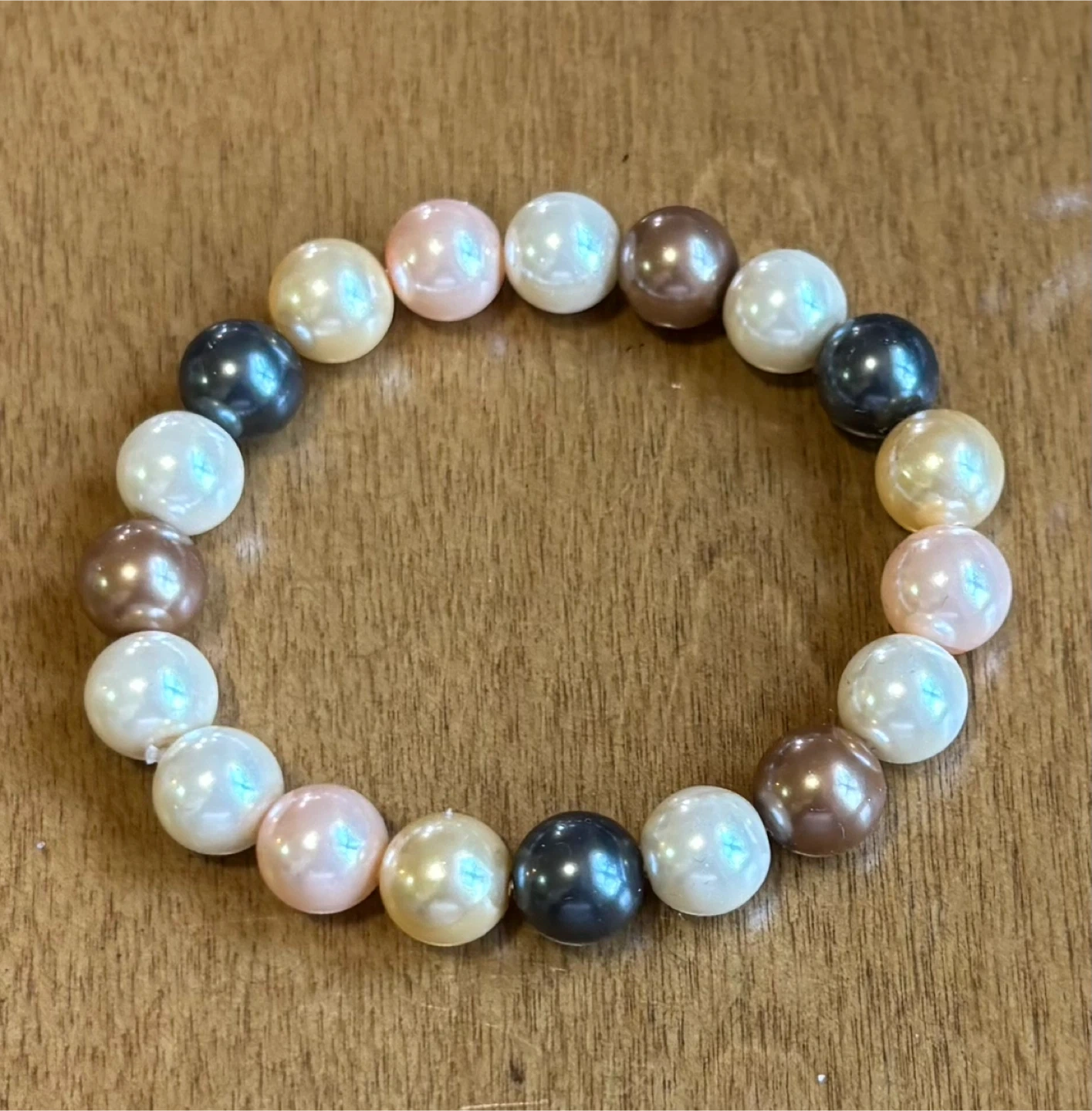 This beaded bracelet features a mix of pearl-like beads in various colors. The beads have a smooth, lustrous finish. It's an elastic bracelet for easy wear.