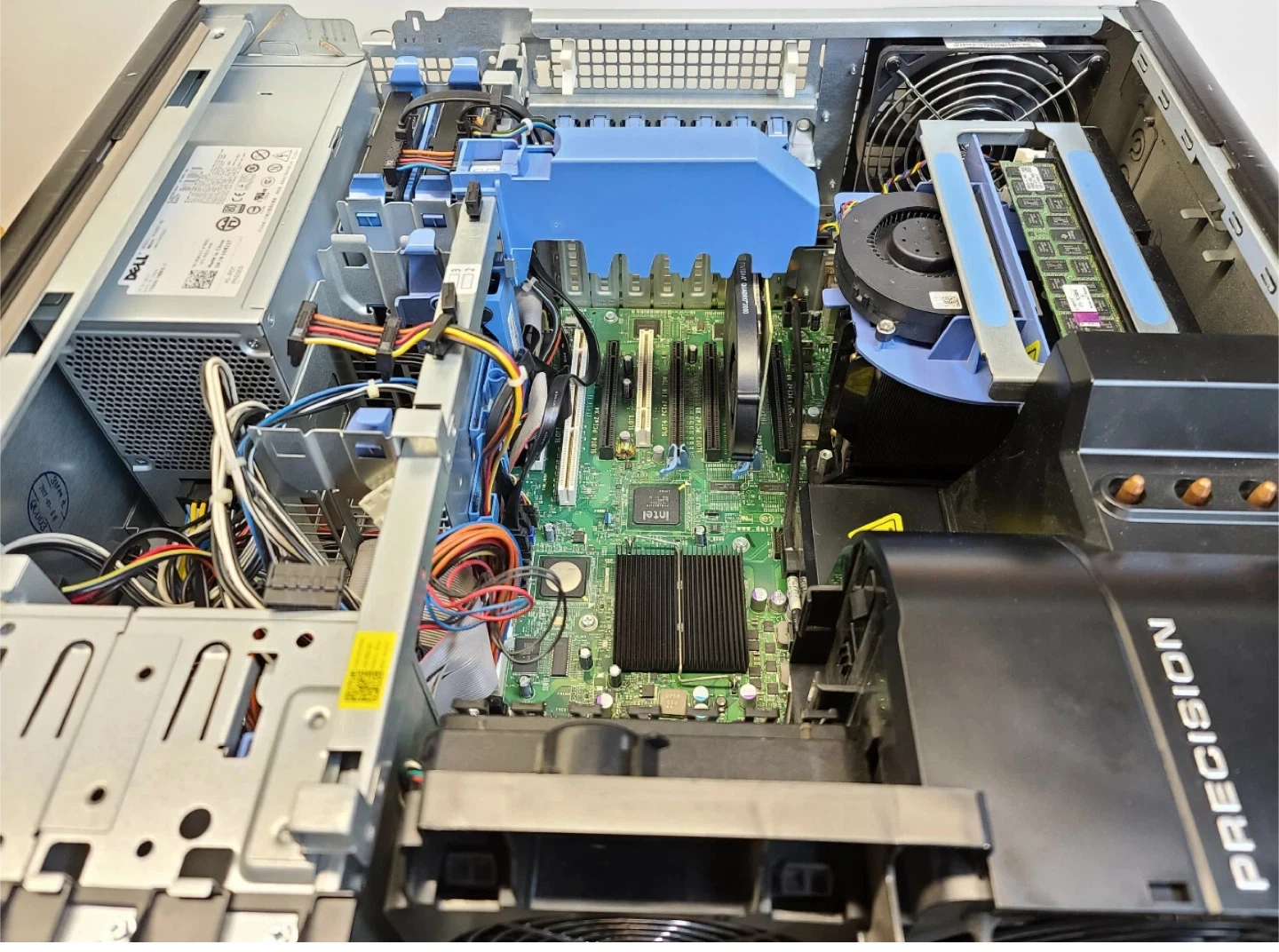 Dell Precision T7500 workstation computer. Black and silver tower. It has a robust internal component layout, suitable for demanding tasks. Includes ample space for expansion.
