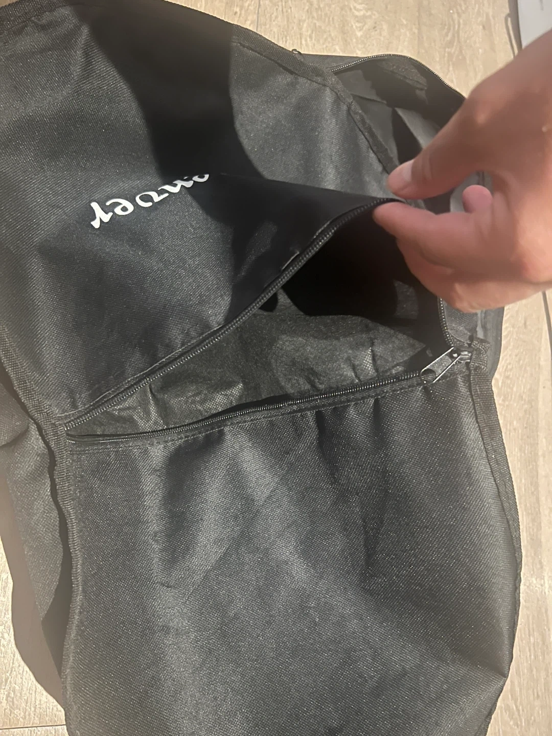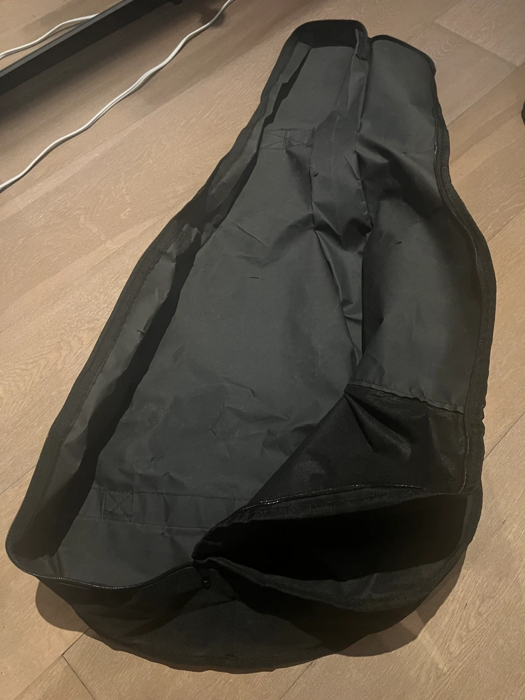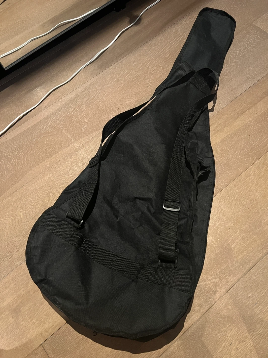 Black padded gig bag for a guitar. It's made of durable nylon material and features adjustable shoulder straps for carrying. There's also a front pocket for accessories, all zippers working. Denver logo on front, recently cleaned for storage. No longer have guitar.