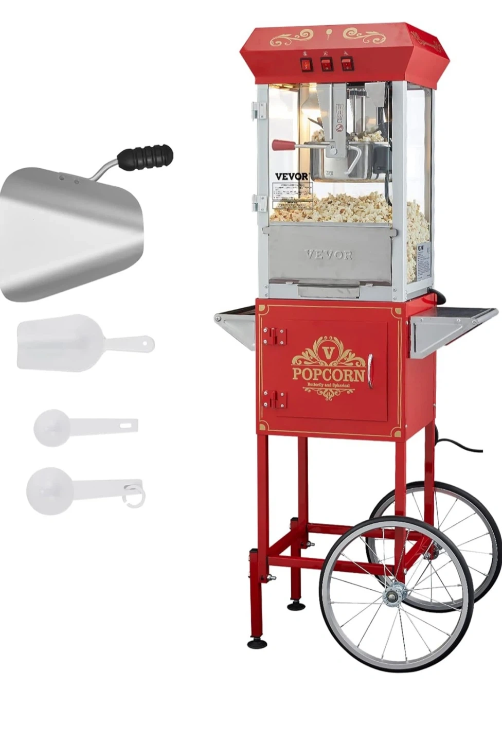 This Vevor popcorn machine cart is in a classic red colour. It comes with a scoop and measuring spoons. Perfect for movie nights or parties!