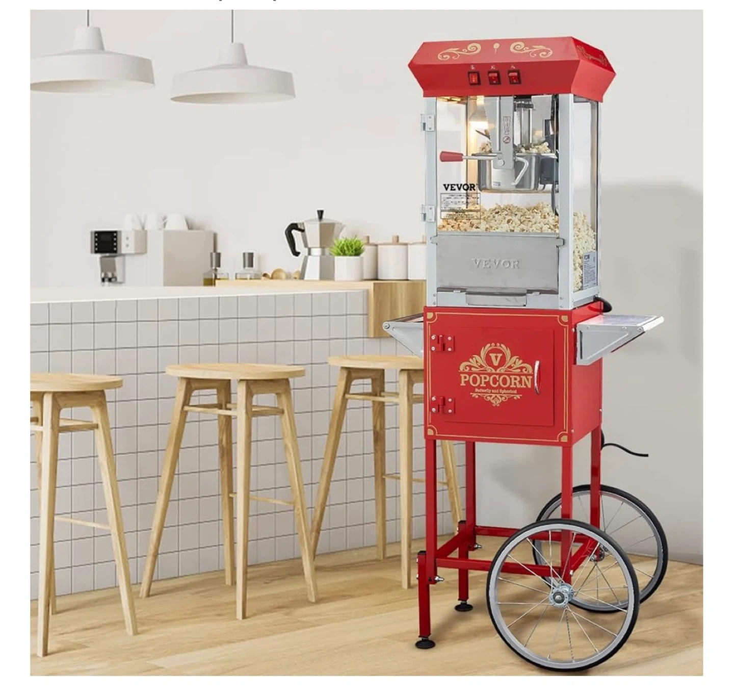 This Vevor popcorn machine cart is in a classic red colour. It comes with a scoop and measuring spoons. Perfect for movie nights or parties!