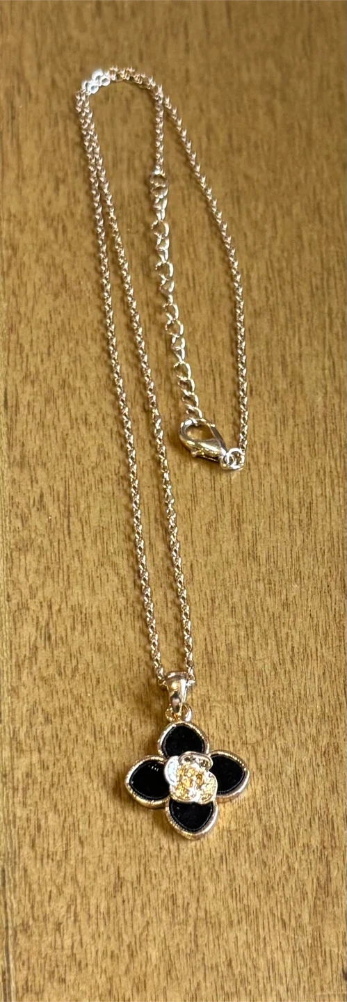 This necklace features a black clover pendant with a gold-tone chain. The clover design has a sparkling gold center accent. It's a beautiful accessory for everyday wear or special occasions!
