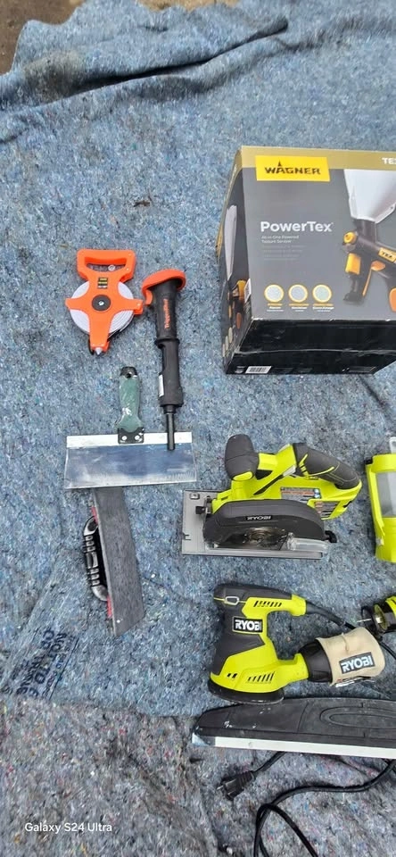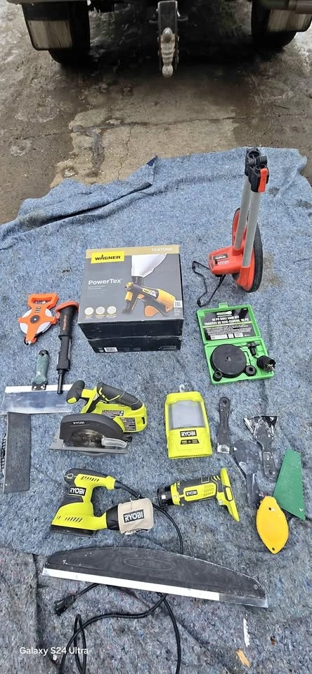 Selling a bundle of tools in good working condition. Ideal for DIY, renovations, or contractor use. Included in the bundle: Wagner PowerTex Texture Sprayer (boxed), TriggerShot manual texture spray gun, Ryobi ONE+ Cordless Circular Saw (tool only), Ryobi ONE+ Cordless Rotary Tool (tool only – no battery), Ryobi Corded Orbital Sander, Ryobi LED Light, Lufkin Measuring Wheel, Hole saw kit, Assorted drywall knives, scrapers, and hand tools (as pictured). Ryobi cordless tools are tool only (no batteries or chargers). Everything works as it should. Selling as a bundle only. Pickup preferred. If the ad is up, it’s available.