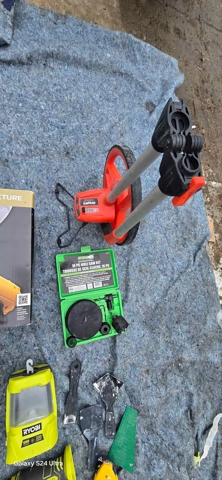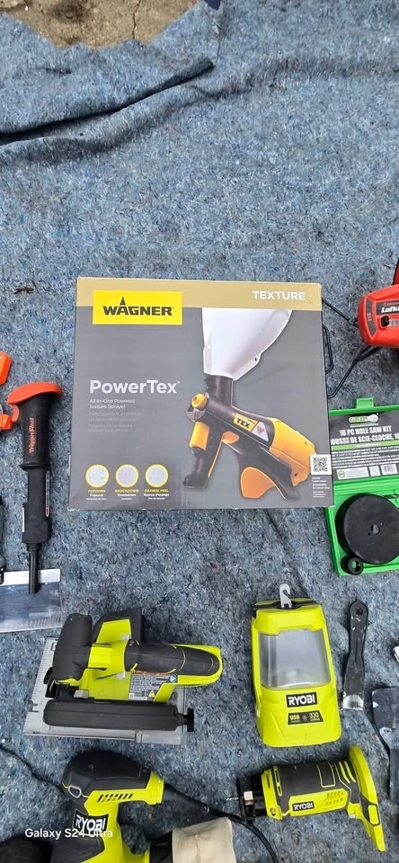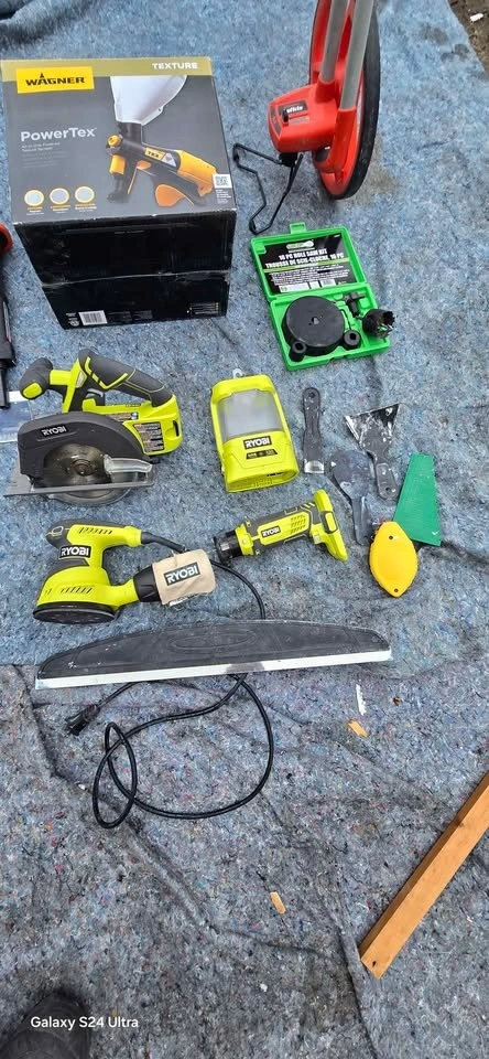 Selling a bundle of tools in good working condition. Ideal for DIY, renovations, or contractor use. Included in the bundle: Wagner PowerTex Texture Sprayer (boxed), TriggerShot manual texture spray gun, Ryobi ONE+ Cordless Circular Saw (tool only), Ryobi ONE+ Cordless Rotary Tool (tool only – no battery), Ryobi Corded Orbital Sander, Ryobi LED Light, Lufkin Measuring Wheel, Hole saw kit, Assorted drywall knives, scrapers, and hand tools (as pictured). Ryobi cordless tools are tool only (no batteries or chargers). Everything works as it should. Selling as a bundle only. Pickup preferred. If the ad is up, it’s available.