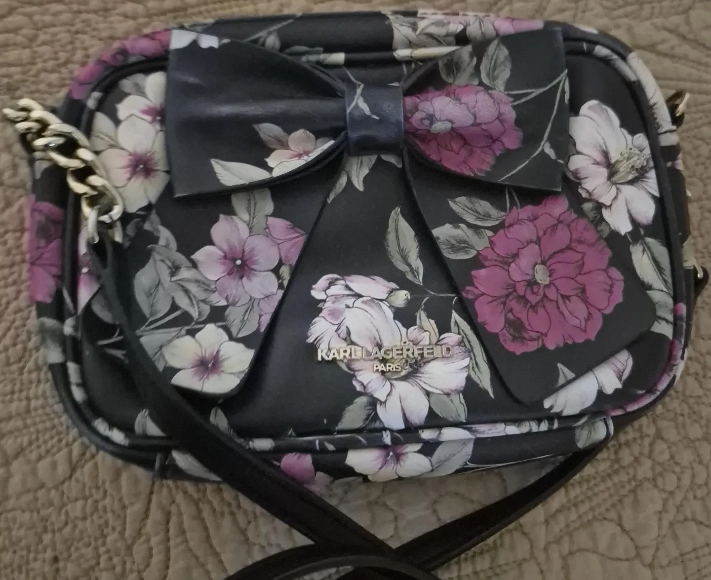 This is a Karl Lagerfeld shoulder bag featuring a black background with a colourful floral print and a decorative bow. It has a chain and leather strap. A stylish accessory for any outfit!