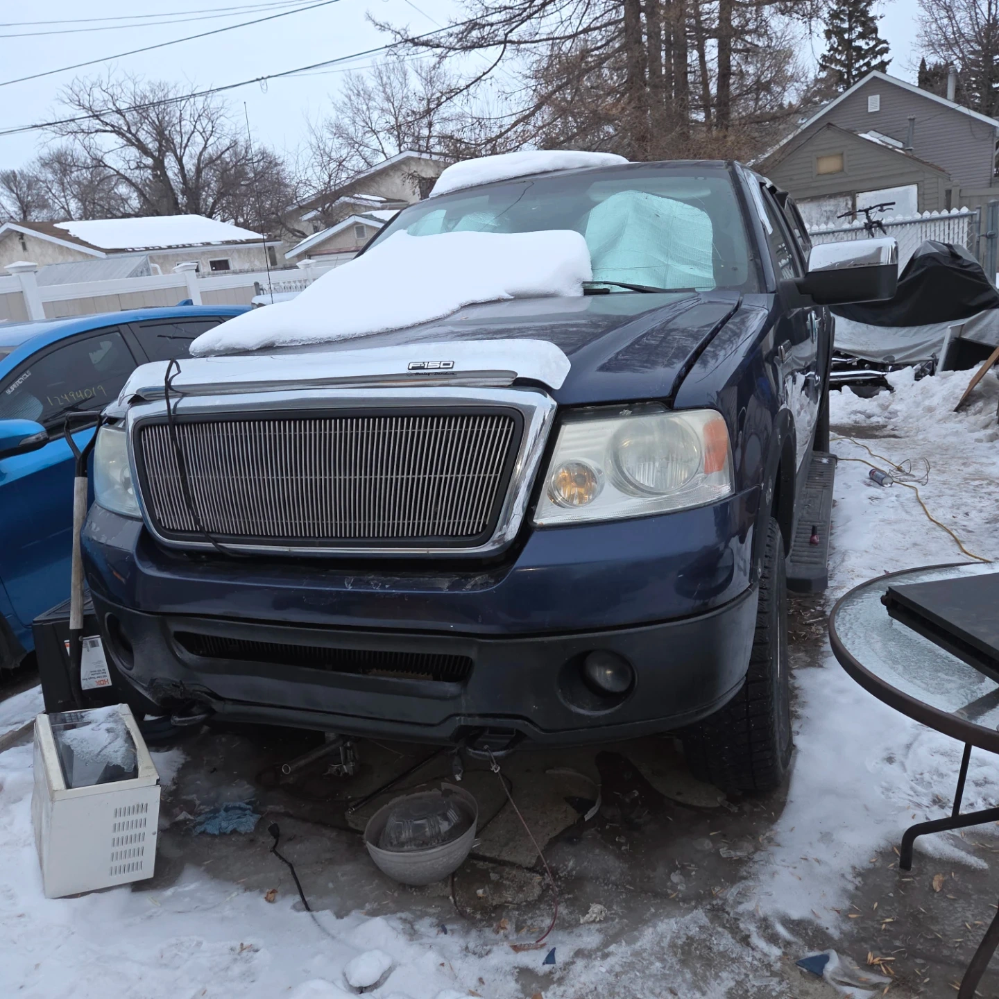 Dark blue Ford F-150 truck with a bed cap. It has custom skull and flame decals on the doors. The interior shows a digital display screen and wood trim accents.fully loaded lariat 252000km i bought this truck at the beginning of last summer with the aspirations of starting my own jack of all trades business because being on aish is non livable.upon my first job the timing went out,I have bought all brand new parts for a complete trimming job.even bought all the speciality tools,the absolute only thing left to buy is an oil pan gasket.only because I believe if youre gona be that deep into it may as well fix everything.but my rent to own landlords( I just thought they where THE LANDLORDS) SCREWED OFF IN DECEMBER,without my knowledge,I only knew something was up when I could no longer hear the 10 feral dogs.needless to say they trashed the upstairs that bad,what good about it is rhe real landlords gave me till may since there os extensive renovations.tge bad is I've frozen my hands before and won't have a chance to complete the job.ive repaired all rust and sprayed the box and lower cab with box liner for extra toughness has studded tires.knn aftermarket style filter( new)aftermarket headset unit.ive put countless hours into my truck and being on aish and what Danielle Smith is doing to the most vulnerablevof us despicable and on top of my current situation I have come to the realization that I have to try and sell it to a lucky new owner.im hoping of just breaking even on what I paid and the large investment in proper parts and tools. Not counting my extensive hours into my truck.so im asking 4000 obo.as soon as the guides broke I shut it off as to not cause any more damage.a tow or tailor will be required.i I vested all the money I saved for years so I could try to better my life. But this is the curve ball I was given instead.and since im being fully transparent here if you happen to have a garage and room available and you are the actual owner well im forcefully looking.if youre on acreage I also have a 10 by 10 fully insulated with loft shed/ tiny house.or if youre looking for a similar shed also contact me.please.i have enough tools to open a garage so if you need a handy person on the farm,acreage( getting out of city before it becomes a 15 minute prison wouldn't break my heart.thanks for reading my novel add.lol God bless