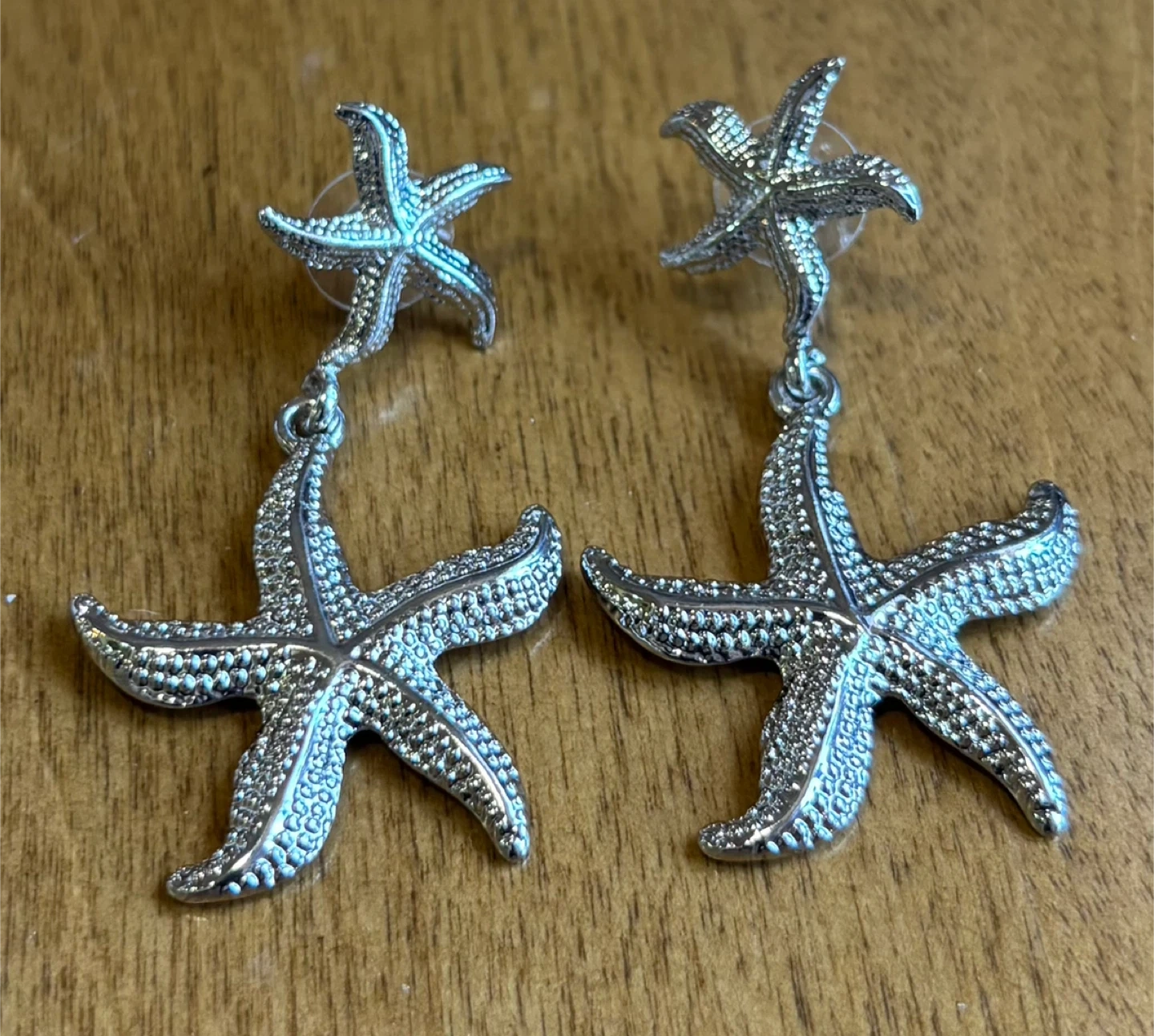Charming gold-tone hoop earrings featuring detailed shell charm and silver tone earrings featuring a starfish. They're perfect for adding a touch of coastal flair to any outfit!