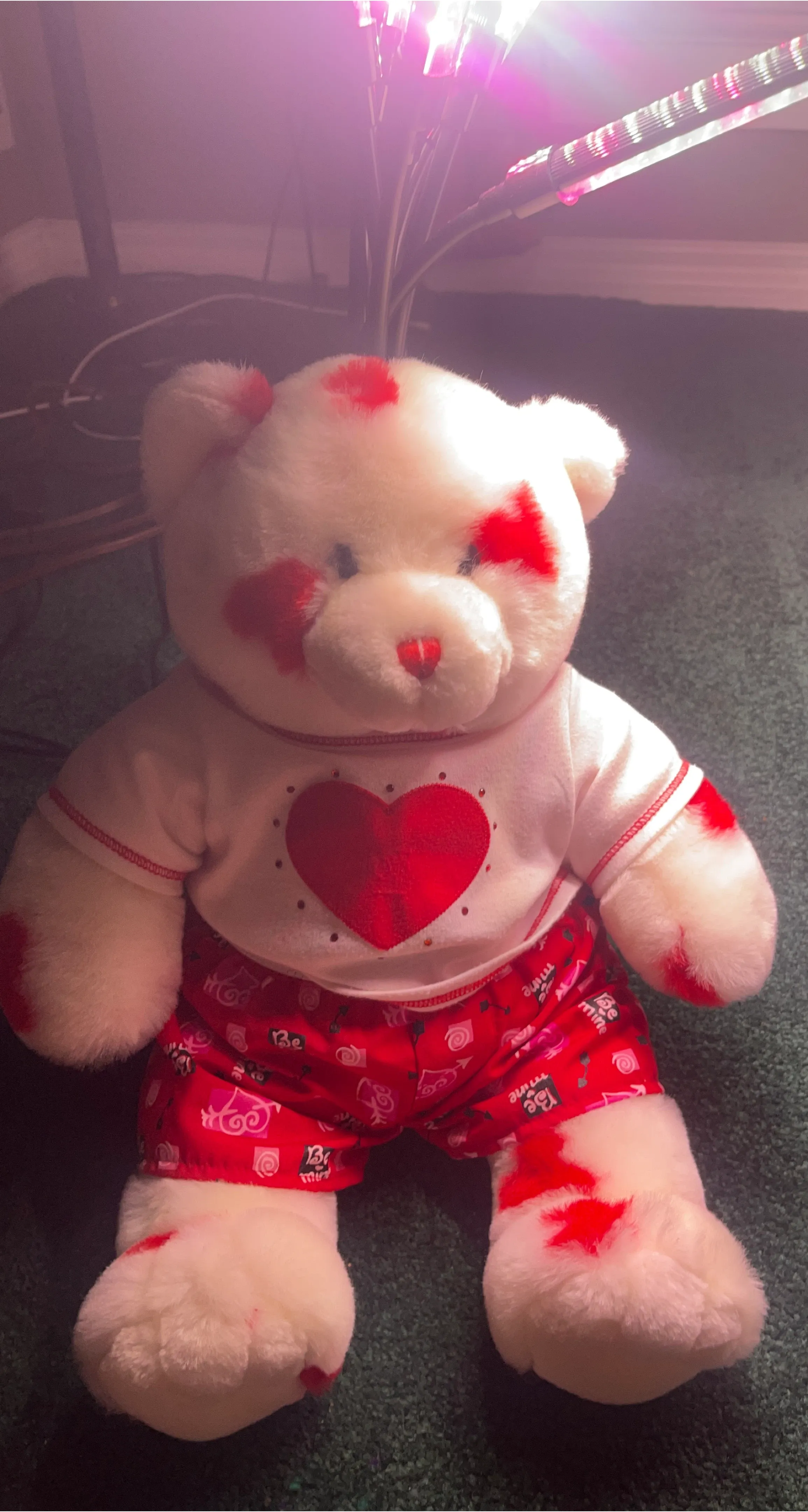 This is a fluffy white teddy bear dressed in a cute outfit. It's wearing a white t-shirt with a big red heart and red pants covered in hearts and 'Be Mine' text. A fun plush friend!
