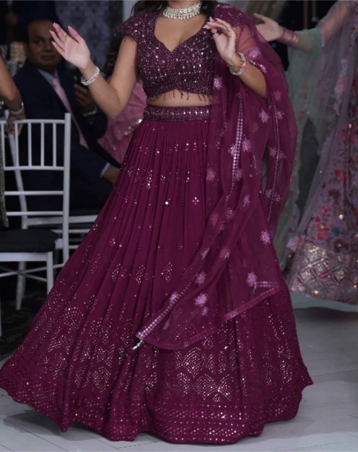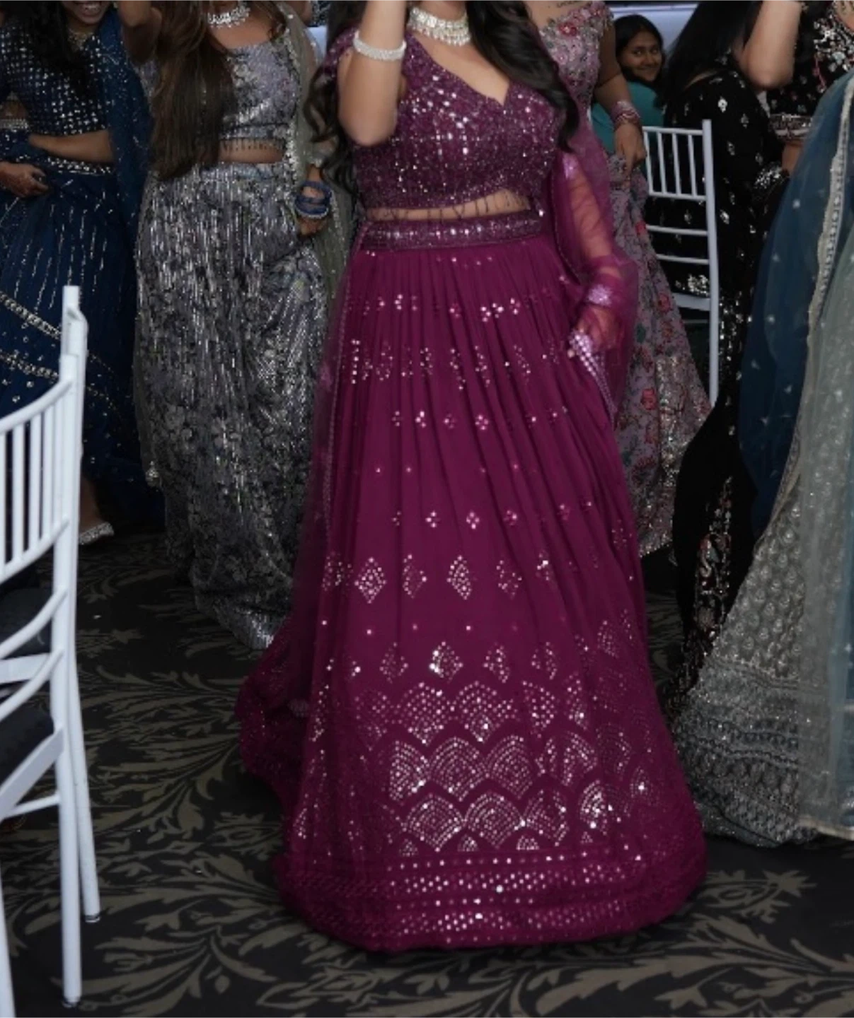 Gorgeous plum-coloured lehenga choli set with intricate sequin and mirror work all over. It's a complete outfit for festive occasions. Material is lightweight and flowy.
