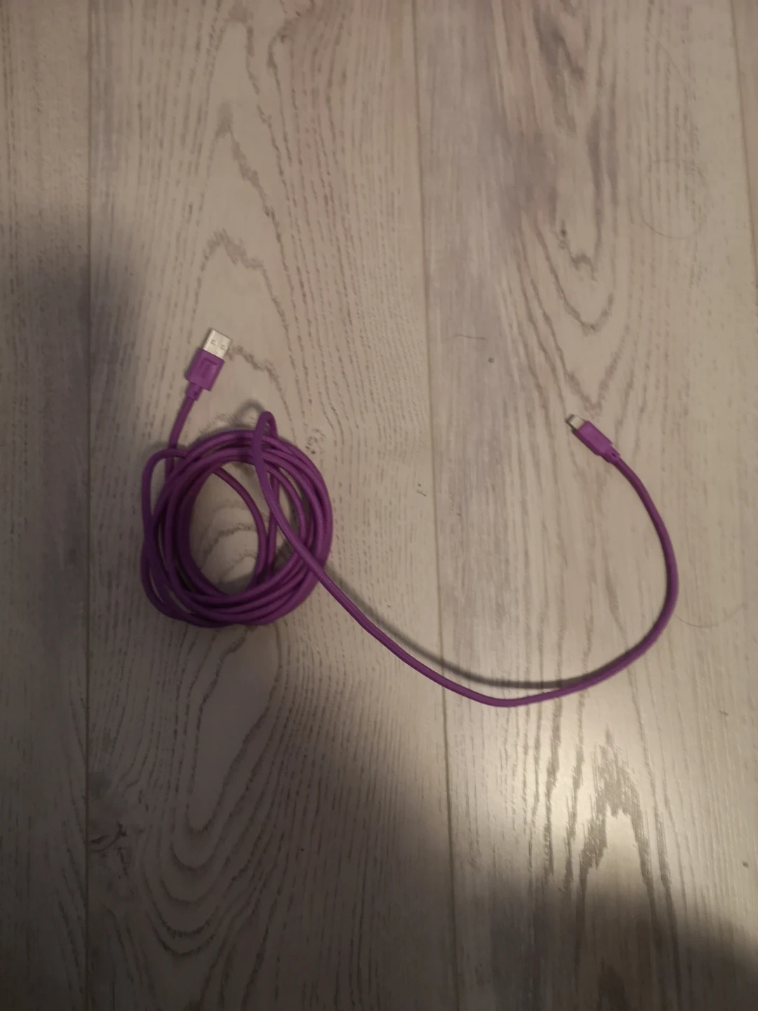 This is a purple charging cable. It has a USB-A connector on one end and a Lightning connector on the other. It's about 3 meter long. This cable is useful for charging Apple devices like iPhones and iPads.