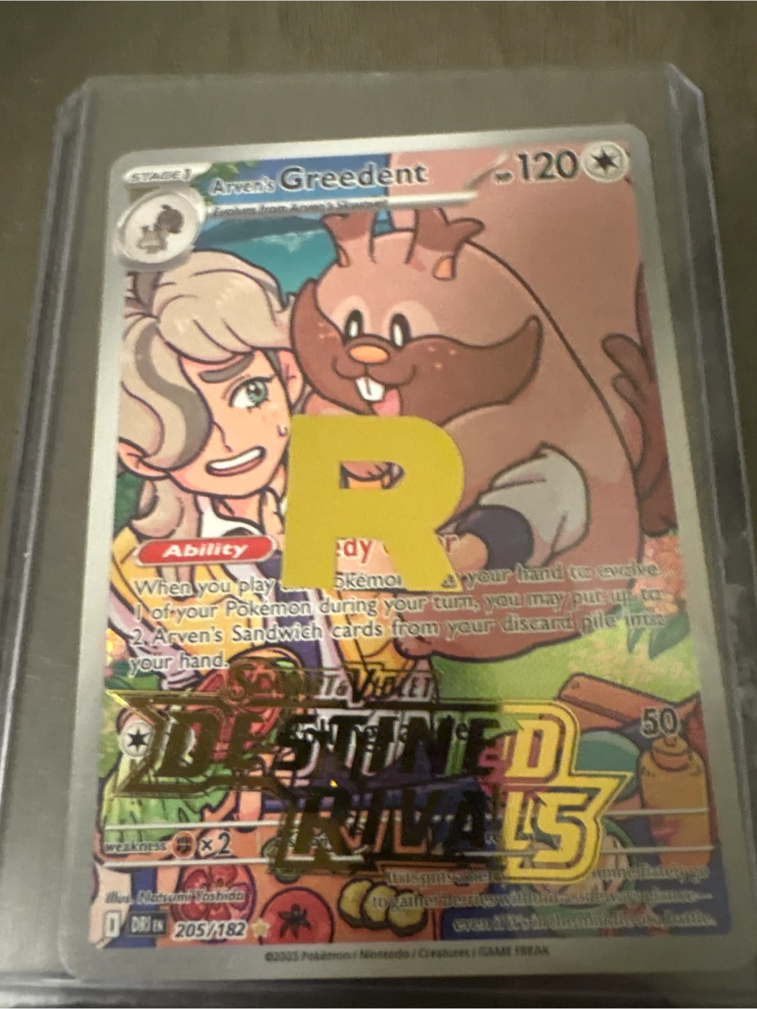 This is a Pokemon trading card featuring Arven's Greedent VSTAR. It has 120 HP and its card number is 205/182. The Destiny Rivals set symbol is visible on the card.