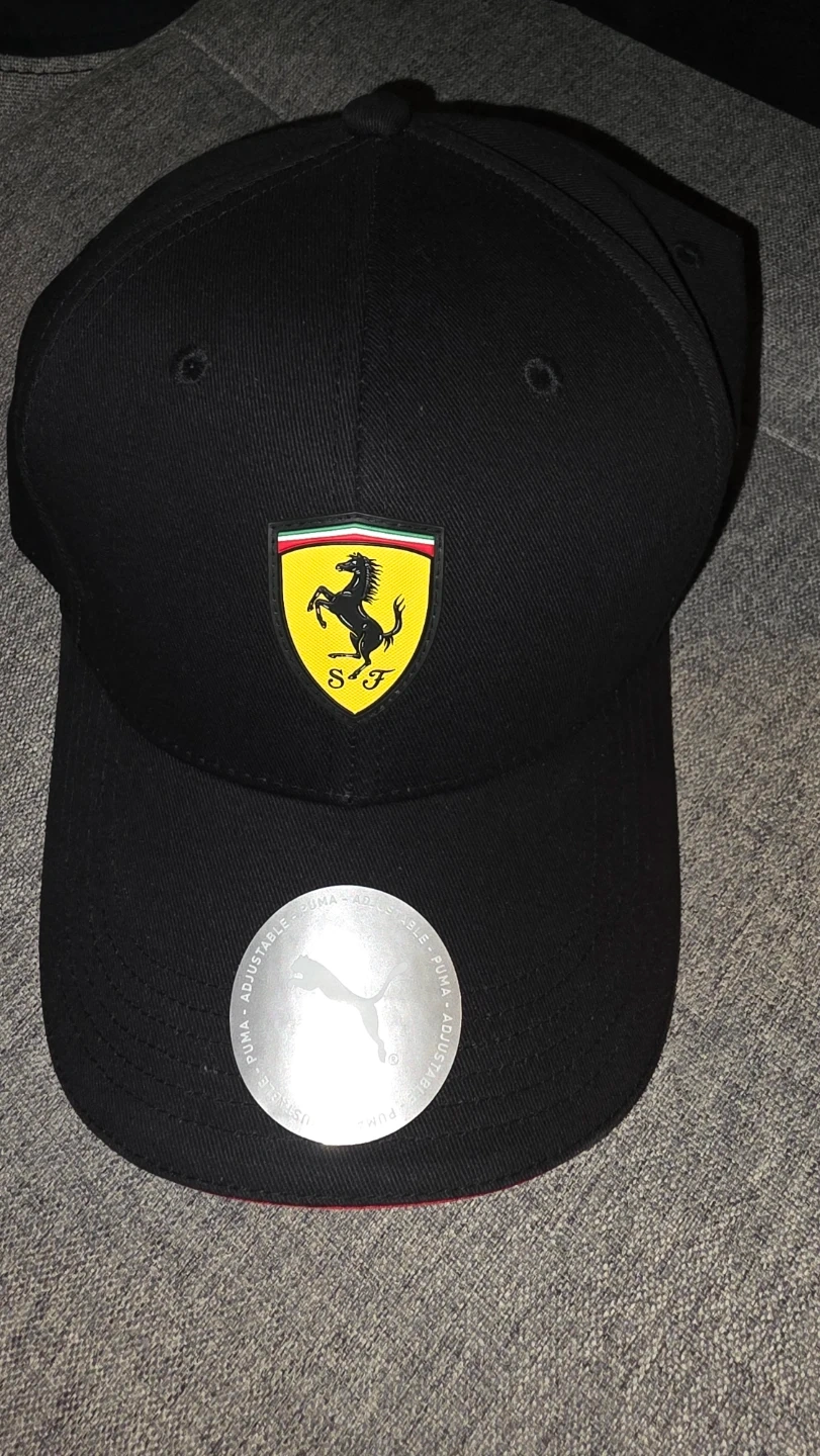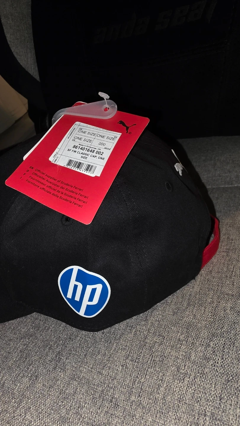 This is a black Puma Scuderia Ferrari cap. It features the iconic Ferrari logo along with HP sponsor logo and a red brim accent. The cap is adjustable for a comfortable fit.
