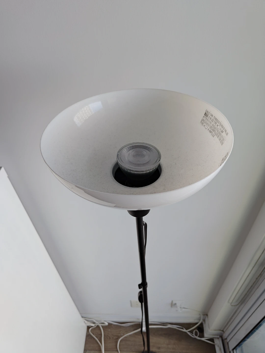 This black floor lamp has a white frosted shade. It uses a maximum 13W LED bulb. Perfect for providing ambient lighting in any room!