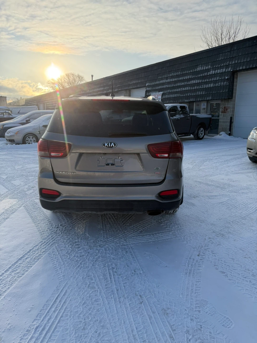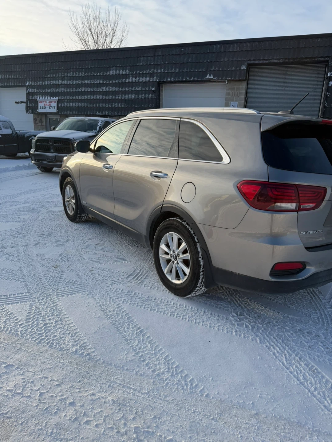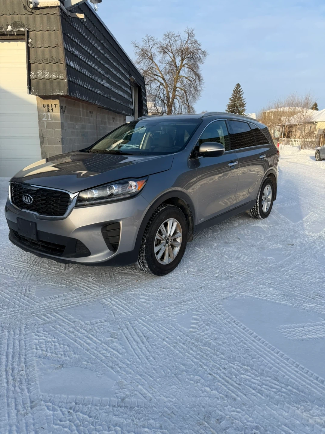 This is a gray Kia Sorento SUV. It's a reliable vehicle that's great for navigating through snowy conditions. This Sorento is ready for your next adventure!