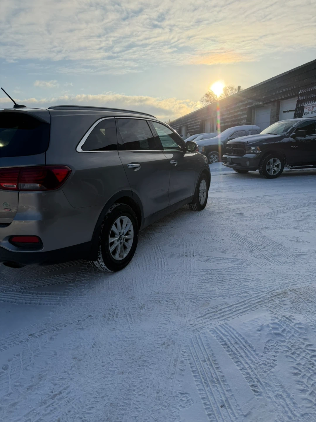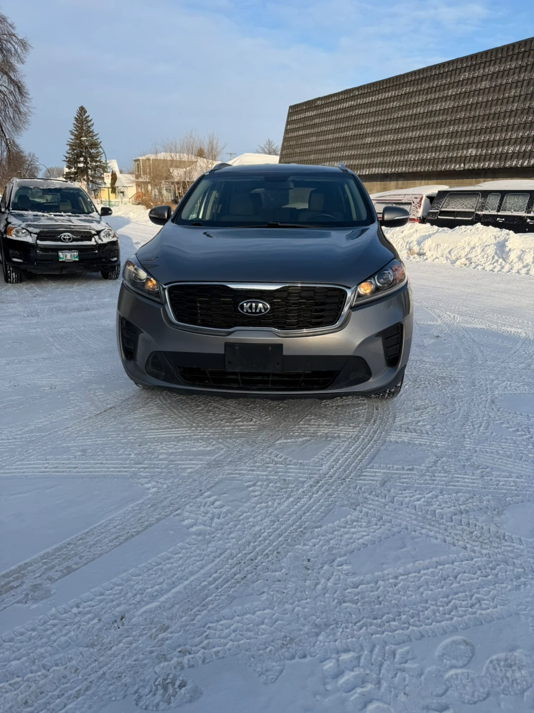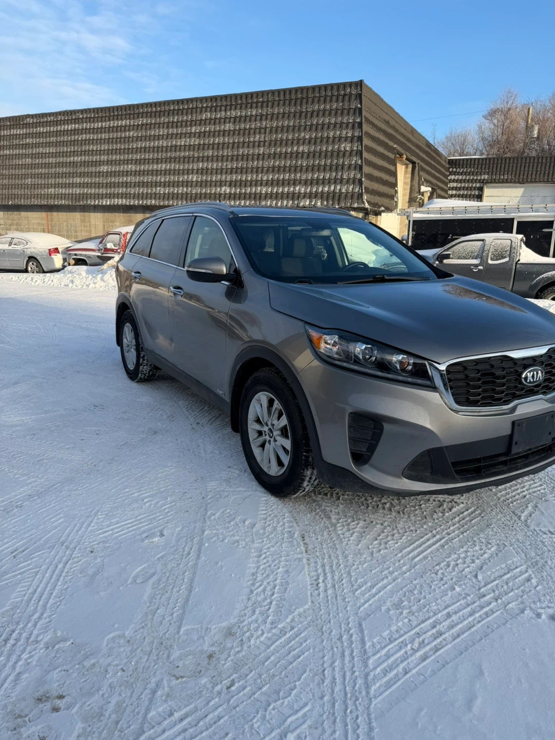 This is a gray Kia Sorento SUV. It's a reliable vehicle that's great for navigating through snowy conditions. This Sorento is ready for your next adventure!