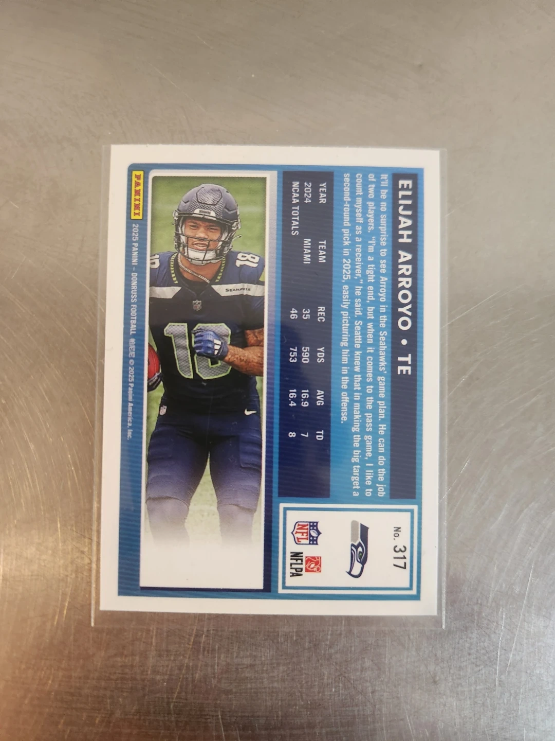 This is a 2023 Panini Rookies Football card featuring Elijah Arroyo. It's a TE card from the 2023 season. Includes college stats for Miami.