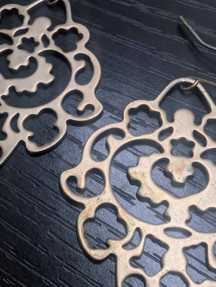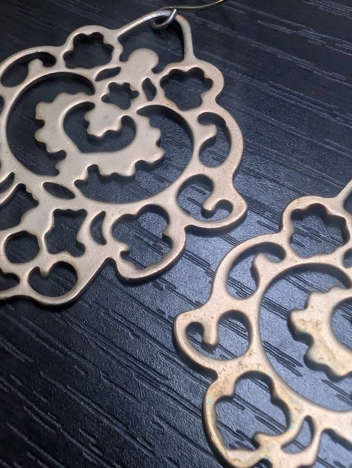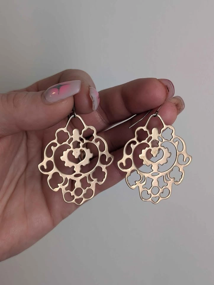 Ornamental dangle earrings in gold colour. Slight damage on center of one earring, as pictured. Please have a look at my other listings. Pickup Yonge and Eglinton Ave by Starbucks.