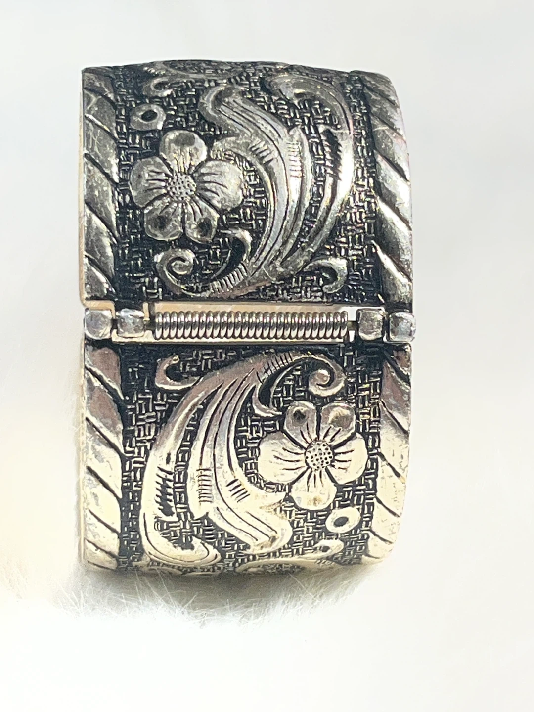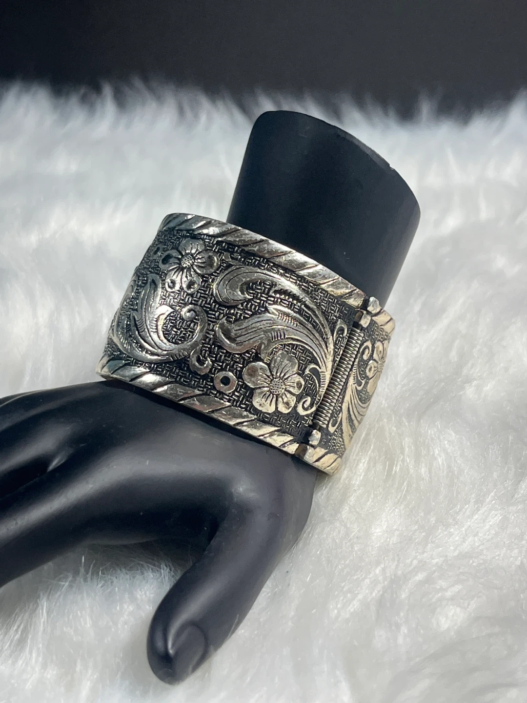 This silver-tone cuff bracelet features a beautiful vintage floral engraving with a textured band. It's a hinged bracelet with a spring closure. The ornate design makes it a lovely statement piece.