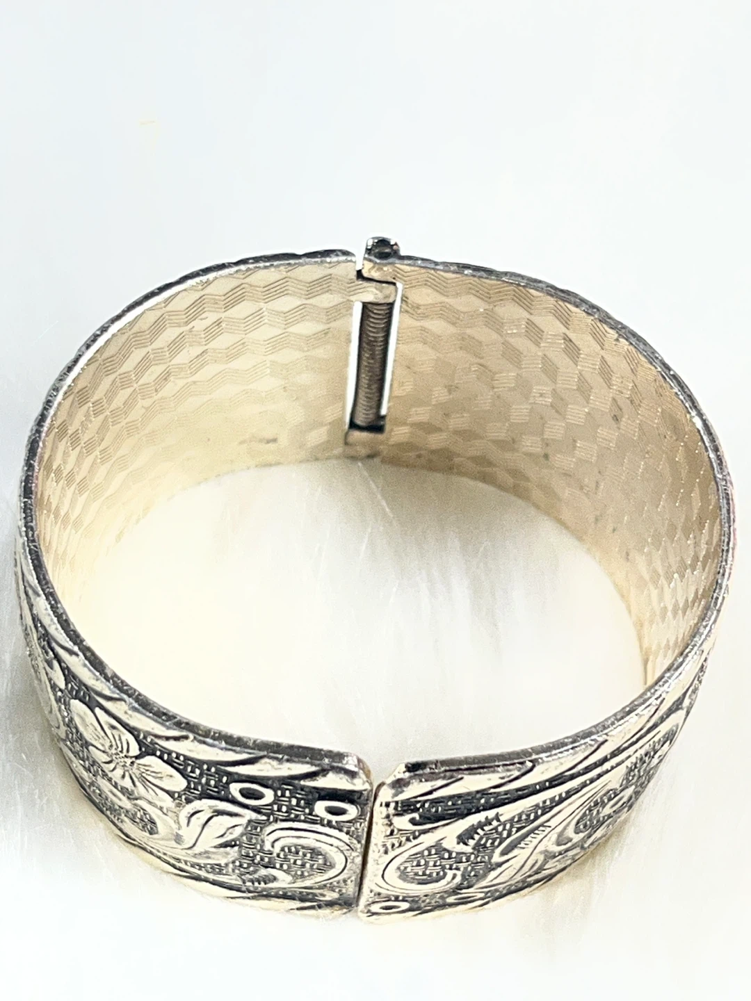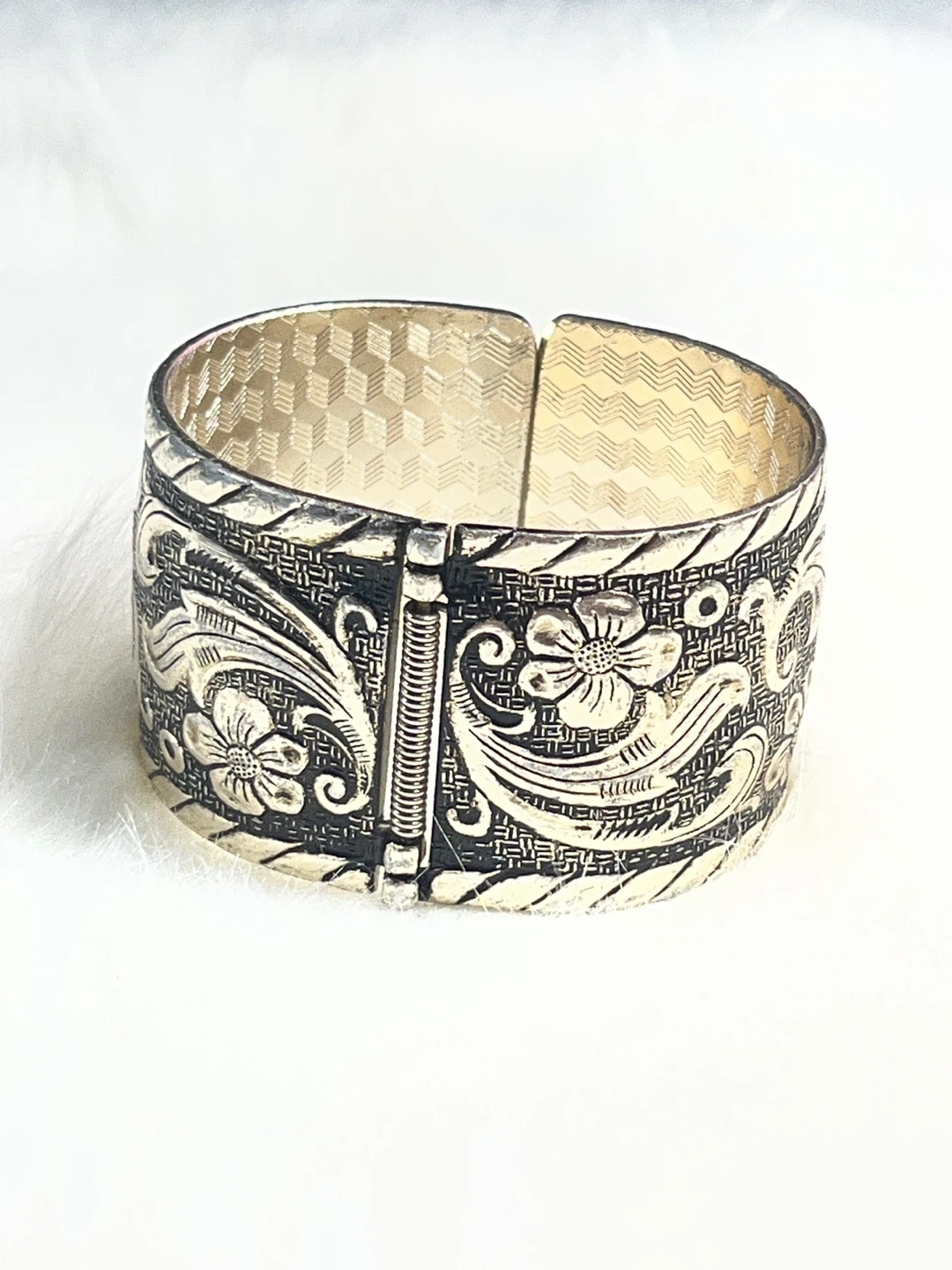 This silver-tone cuff bracelet features a beautiful vintage floral engraving with a textured band. It's a hinged bracelet with a spring closure. The ornate design makes it a lovely statement piece.