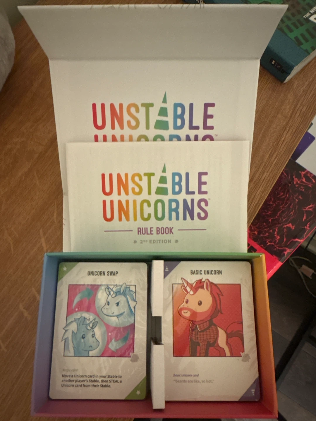 This is the Unstable Unicorns card game, 2nd Edition. It includes the rule book and the main deck of cards. It's a magical game about unicorns and destruction!
