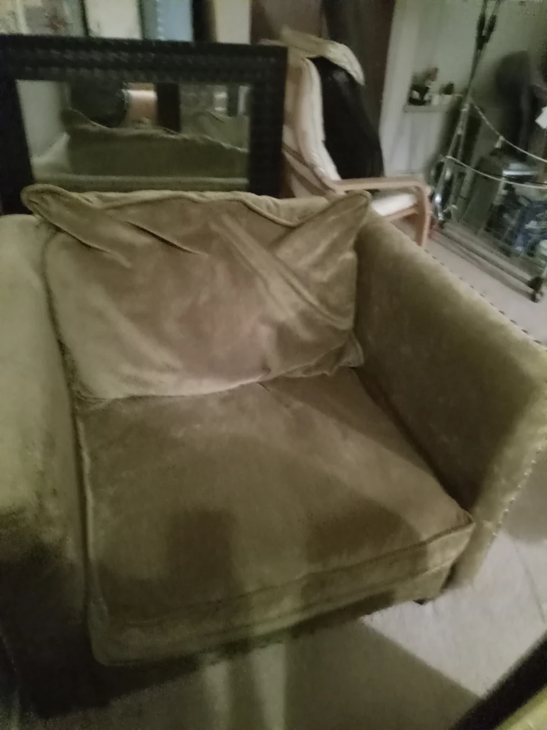 A comfy tan armchair with a plush seat cushion and matching throw pillow. Its fabric appears to be a soft, velvety material. This chair would be a nice addition to a living room or reading nook.