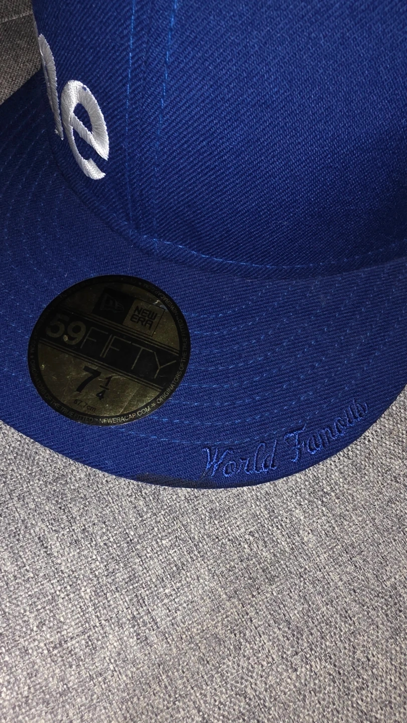 Blue Supreme fitted hat with white 'Supreme' logo. New Era 59FIFT. Features 'World Famous' embroidery on the brim side.