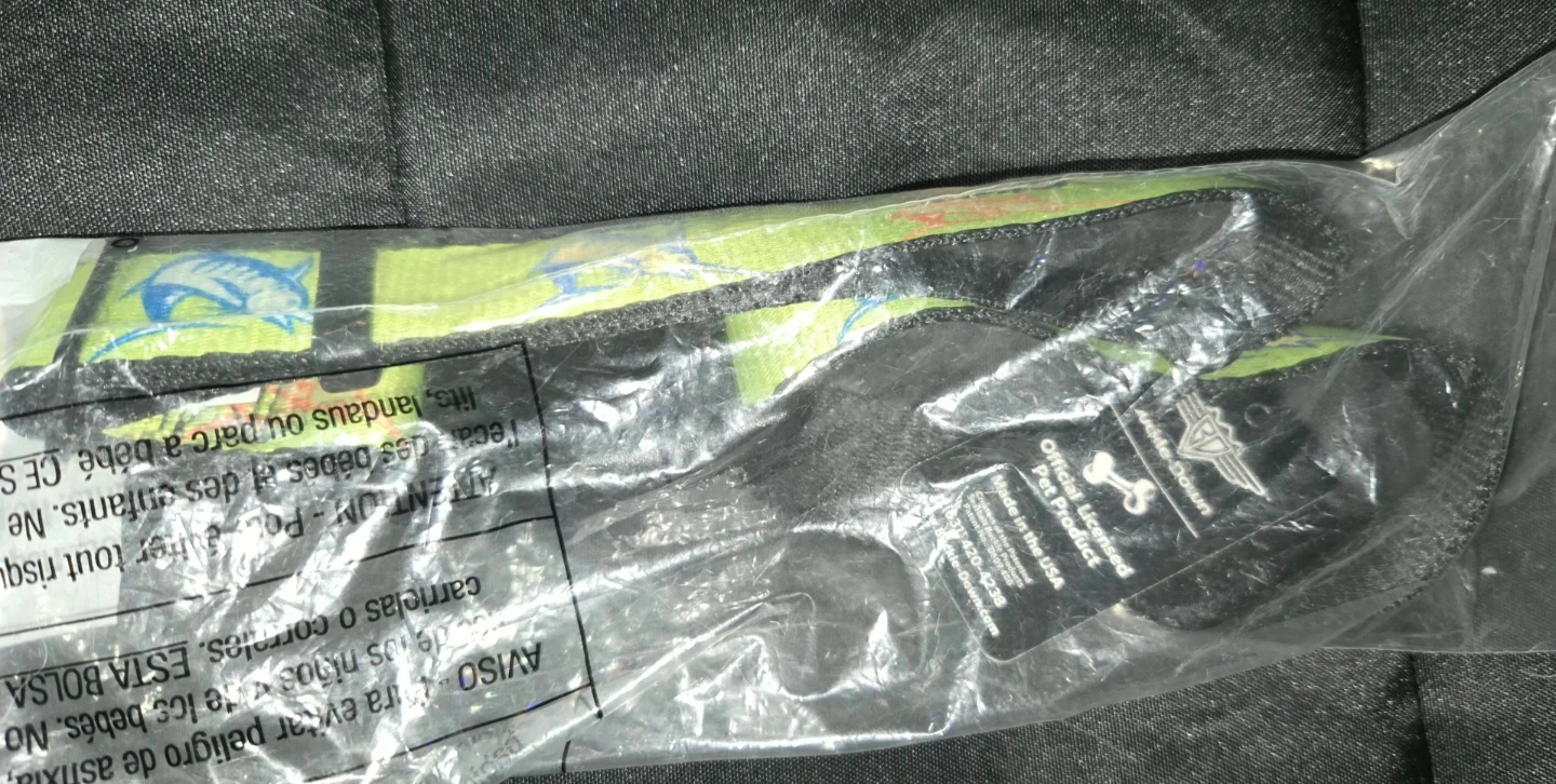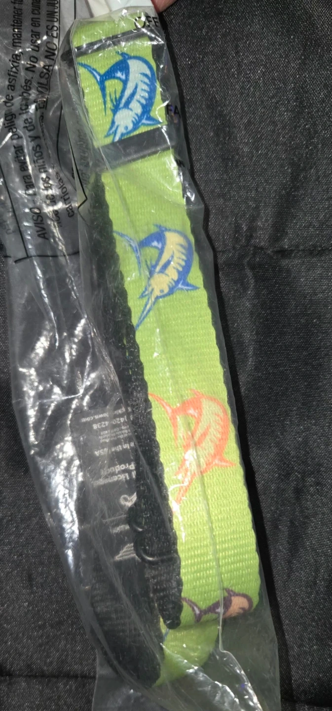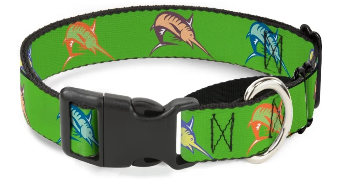 This is a fun dog collar with a marlin print. It's made from durable nylon with a sturdy plastic buckle and metal D-ring for leash attachment. This collar is adjustable for a comfy fit. Great for a dog who loves the water!