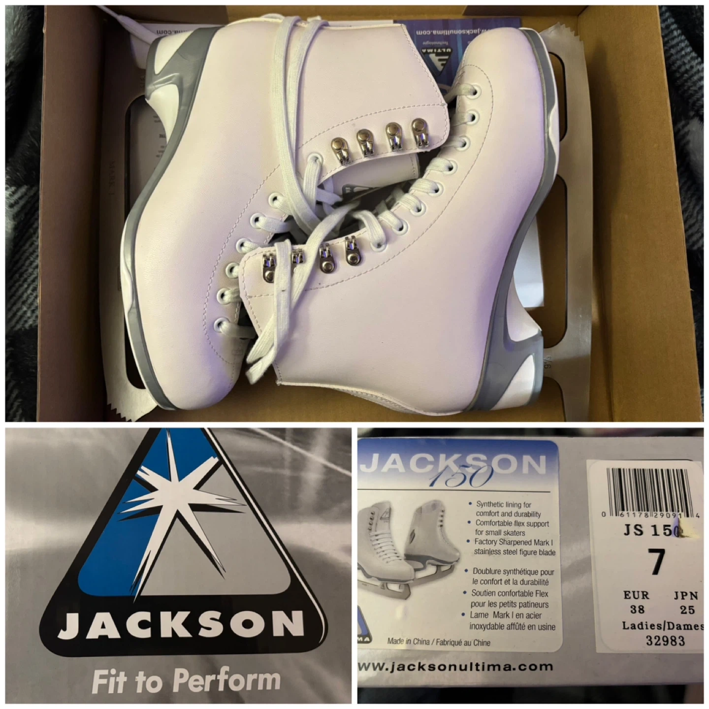 For sale is a pair of white Jackson 150 figure skates. They feature a synthetic lining for comfort and durability, with a comfortable flex. They have only been used once and were sharpened when I purchased them.