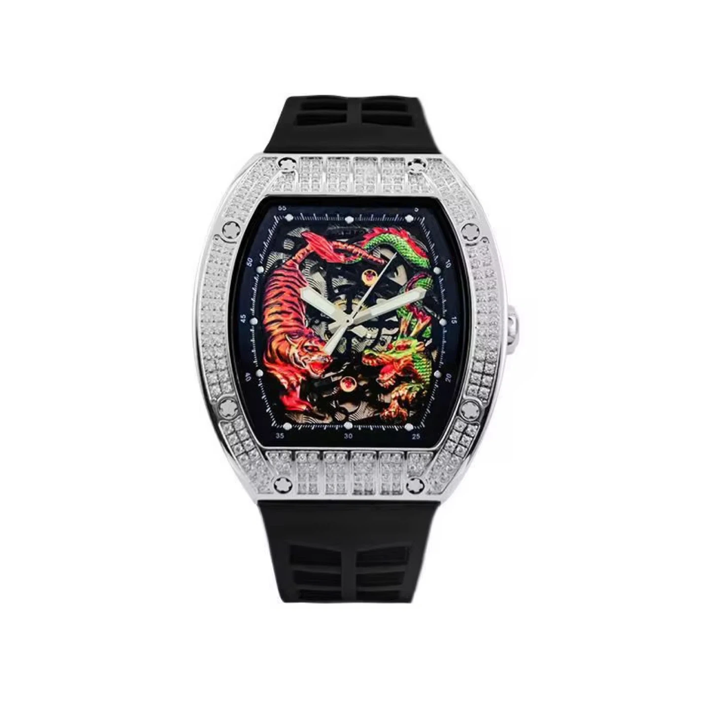 This stylish men's quartz watch features a dazzling crystal-embellished bezel and a unique dial with a tiger and dragon design. It comes with a comfortable silicone strap in a choice of colours. It's designed for everyday wear.