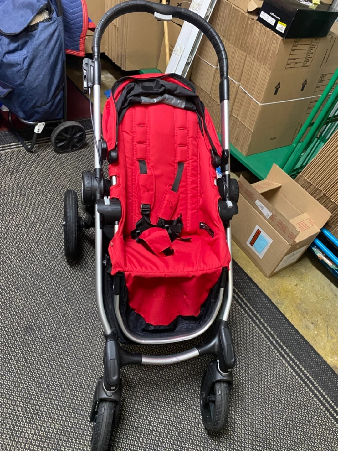 This Baby Jogger City Select stroller comes in a vibrant red. It features a reversible seat and adjustable handlebar. Great for on-the-go adventures with your little one!