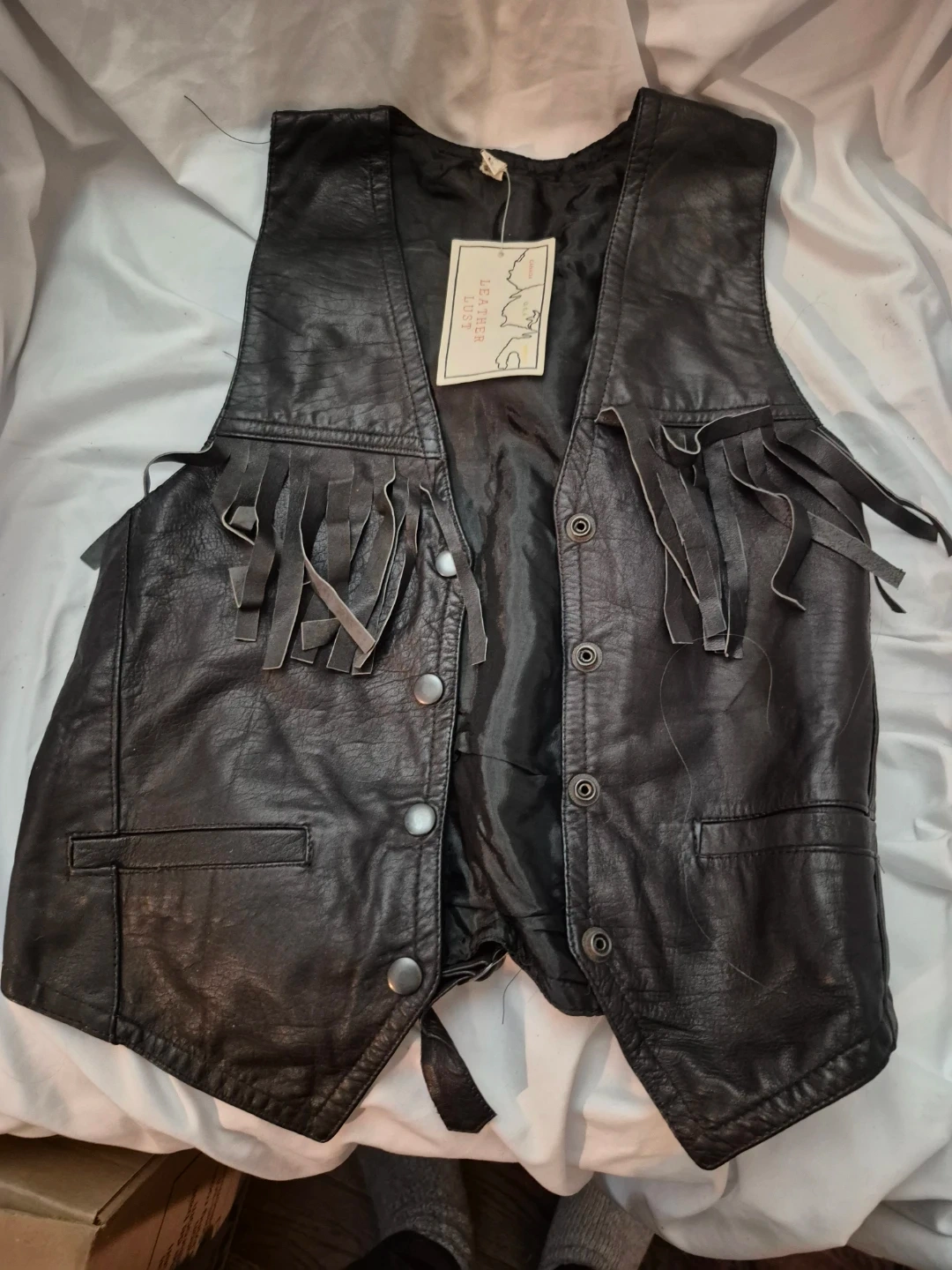 Black genuine leather vest with fringe detailing. It's size large and features a button-up front and two front pockets. The back has an adjustable buckle strap. This vest is great for layering.