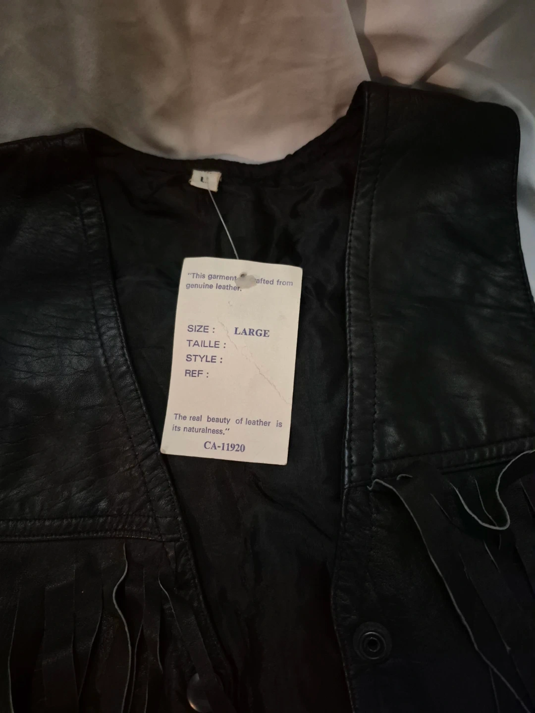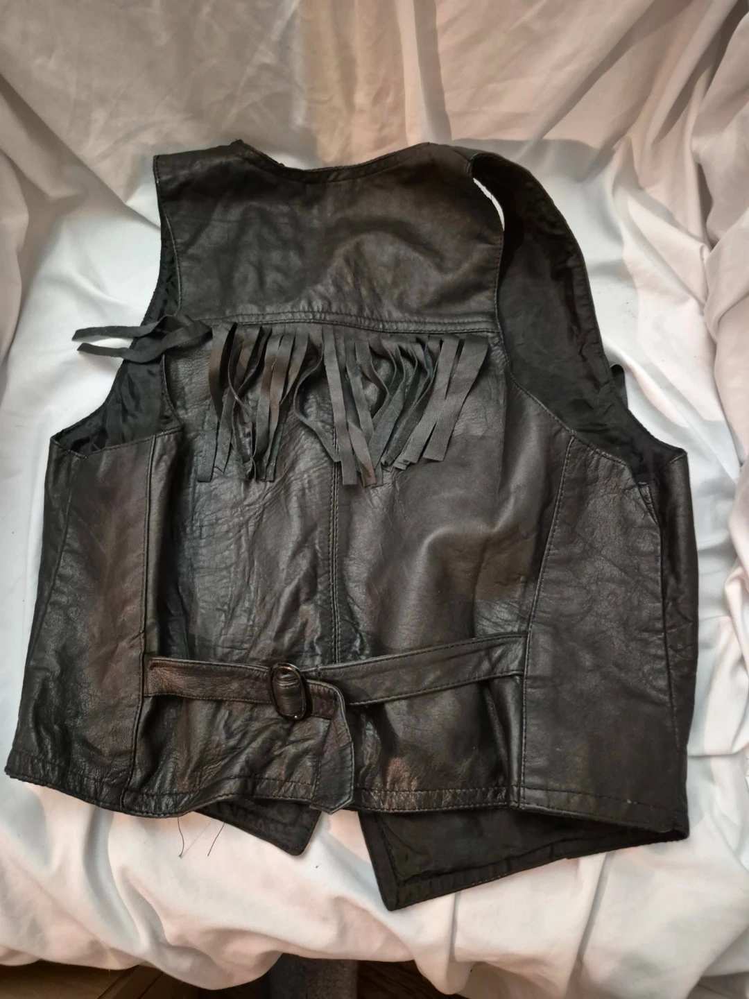 Black genuine leather vest with fringe detailing. It's size large and features a button-up front and two front pockets. The back has an adjustable buckle strap. This vest is great for layering.