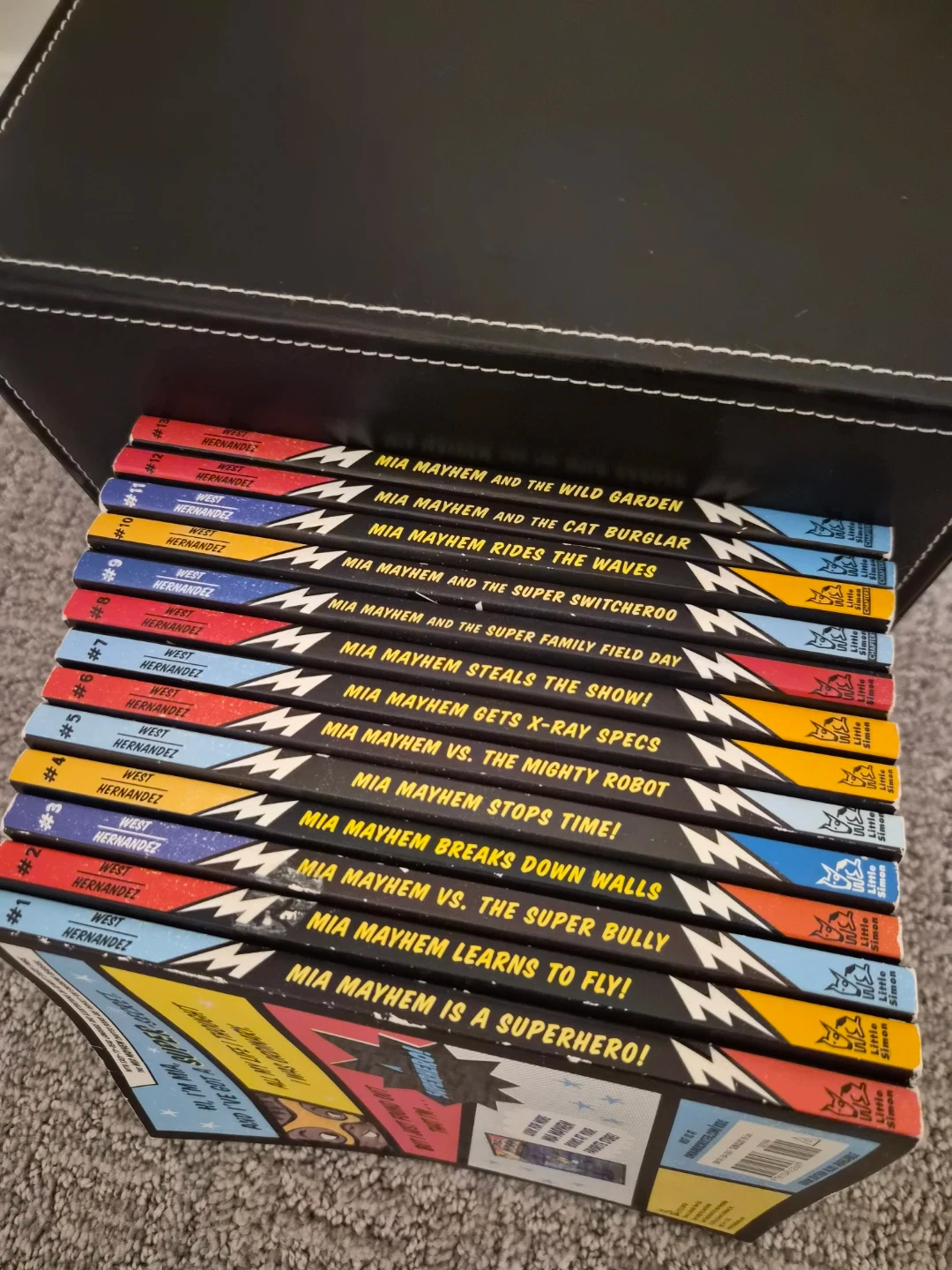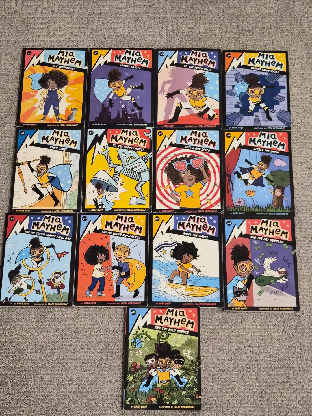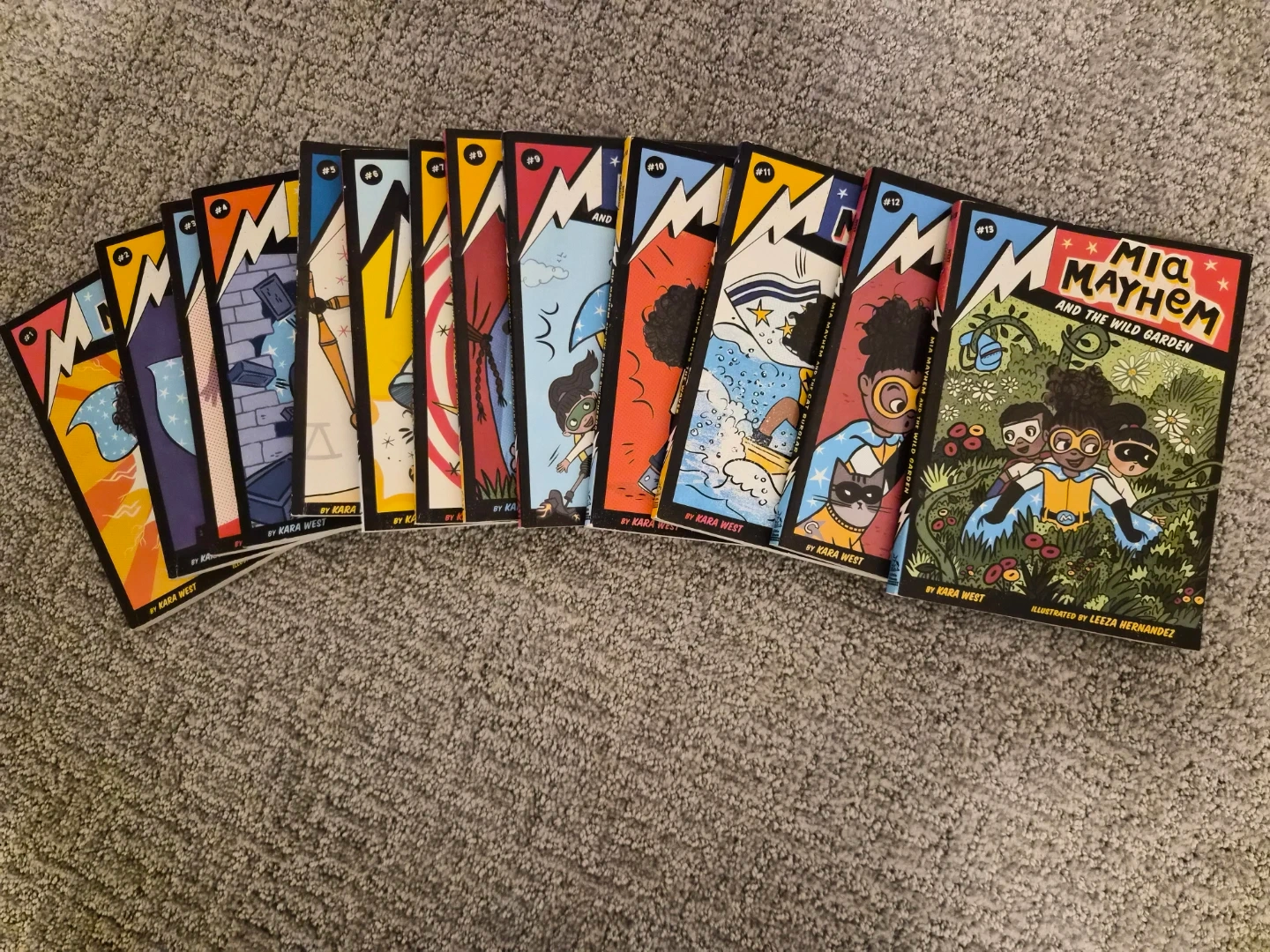 Collection of Mia Mayhem books by Kara West. Includes titles like 'Mia Mayhem and the Wild Garden' and 'Mia Mayhem is a Superhero!'. Great for young readers interested in adventure stories. It's a fun series for kids!