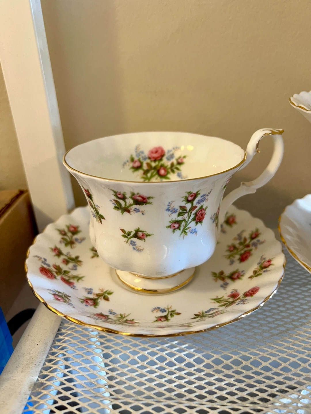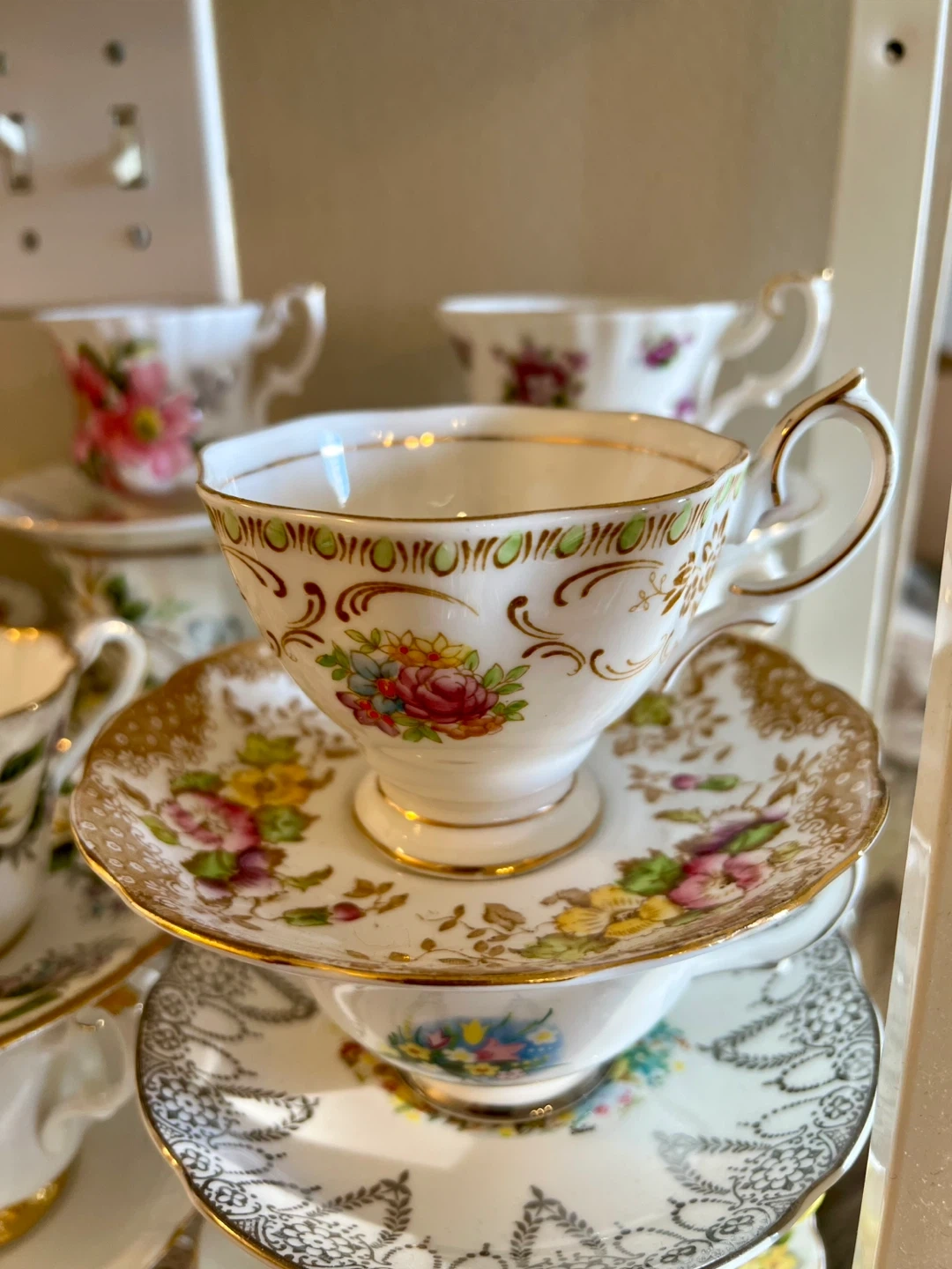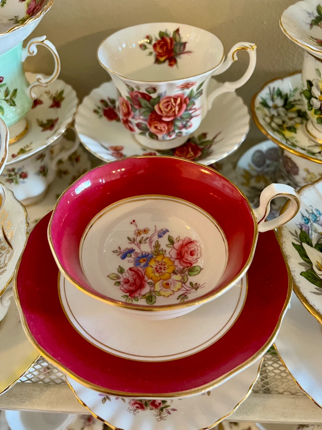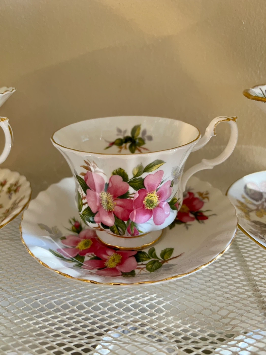 Beautiful Royal Albert teacups and saucers, each featuring a unique floral pattern.