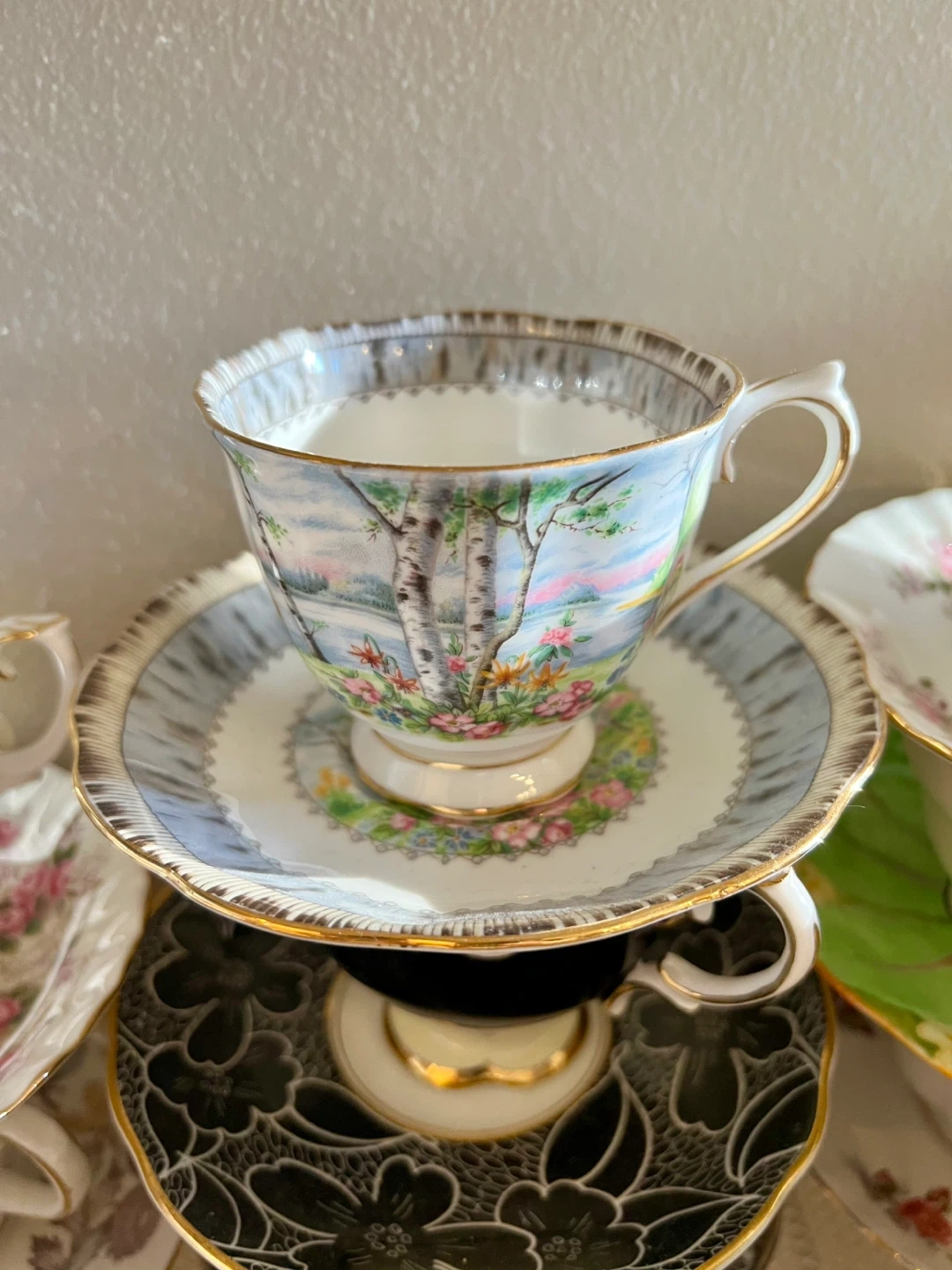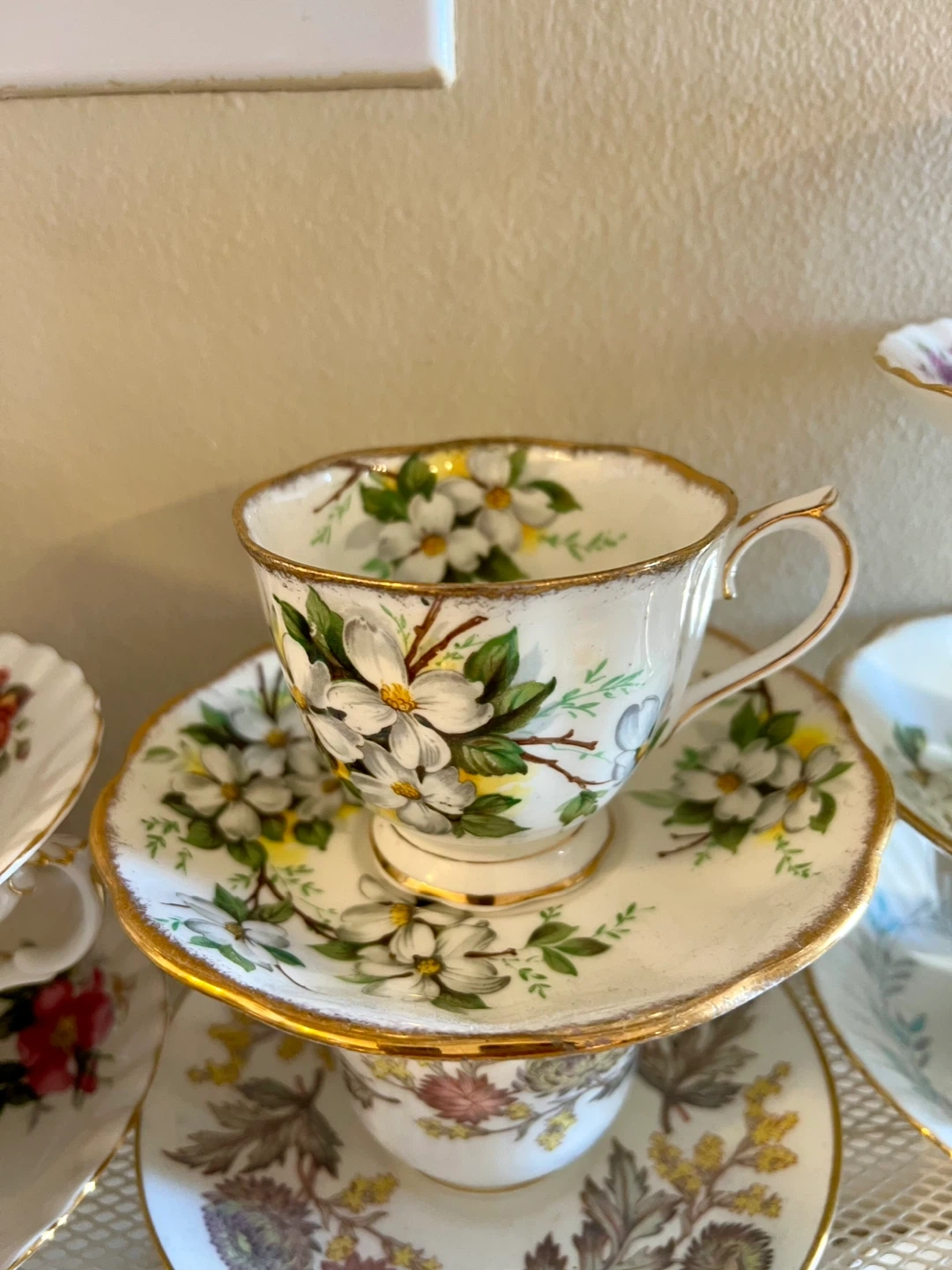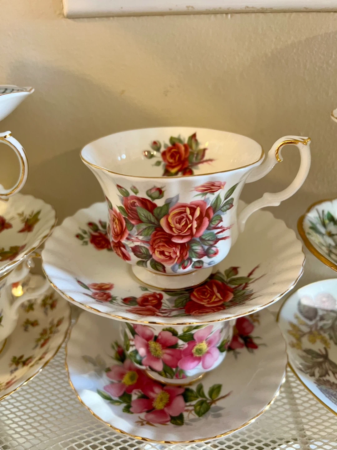 Beautiful Royal Albert teacups and saucers, each featuring a unique floral pattern.