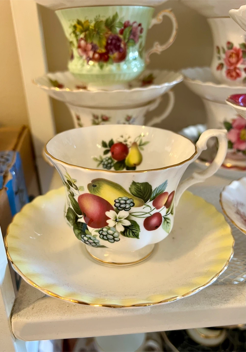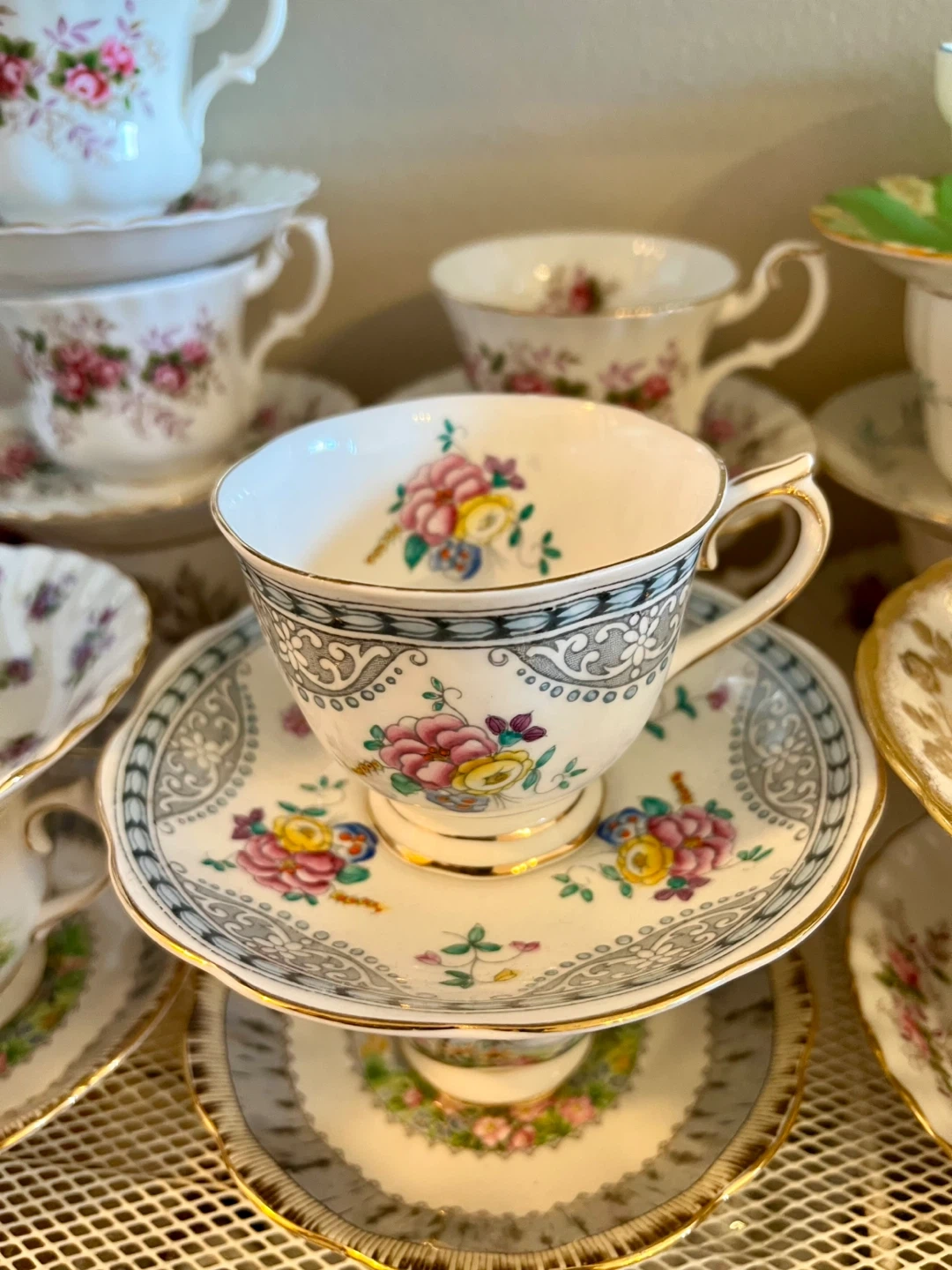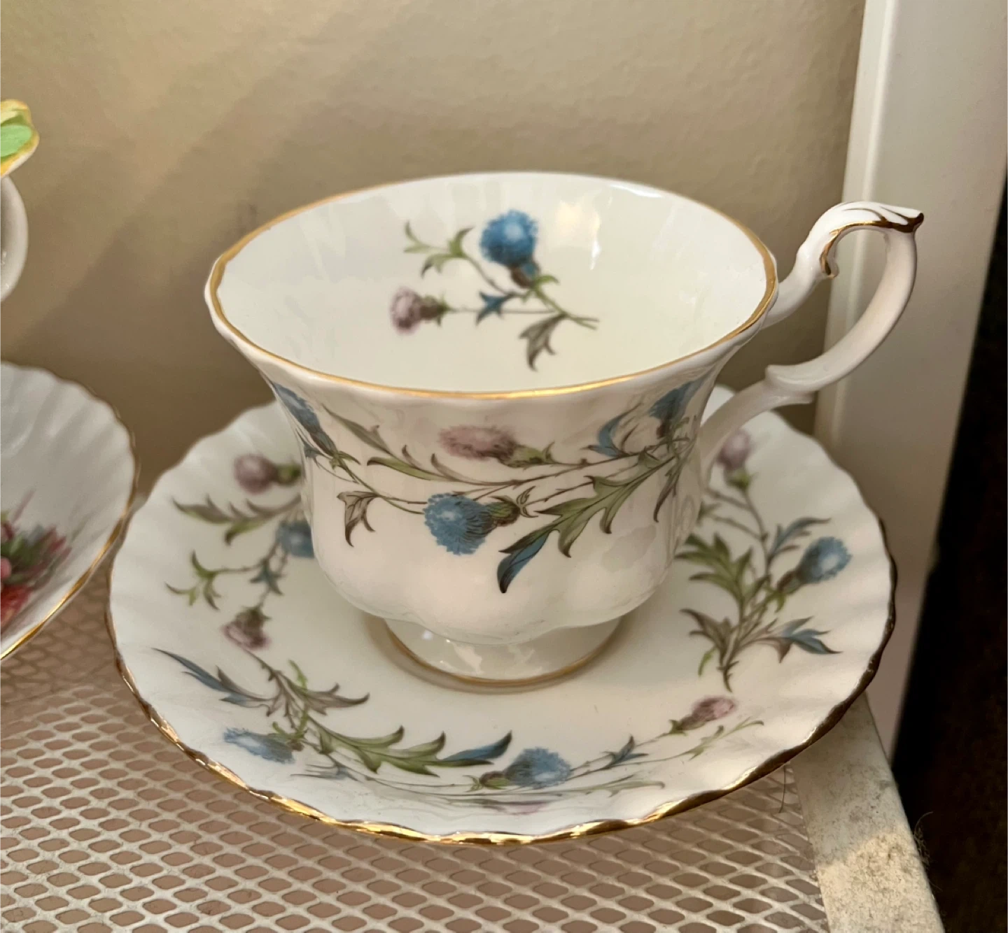 Beautiful Royal Albert teacups and saucers, each featuring a unique floral pattern.