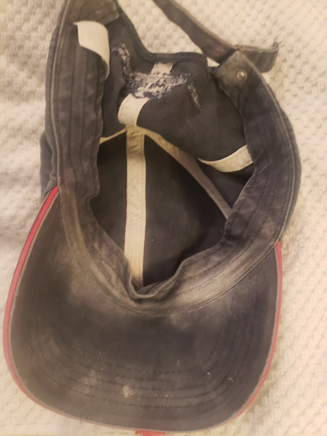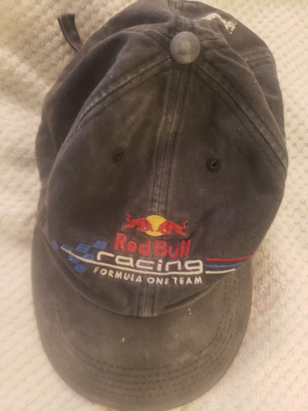 This is a Red Bull Racing Formula One Team baseball cap. It's a dark grey, washed-out style with red and blue accents. The inside shows some wear, typical for a used cap.(used for many taping jobs) including sanding