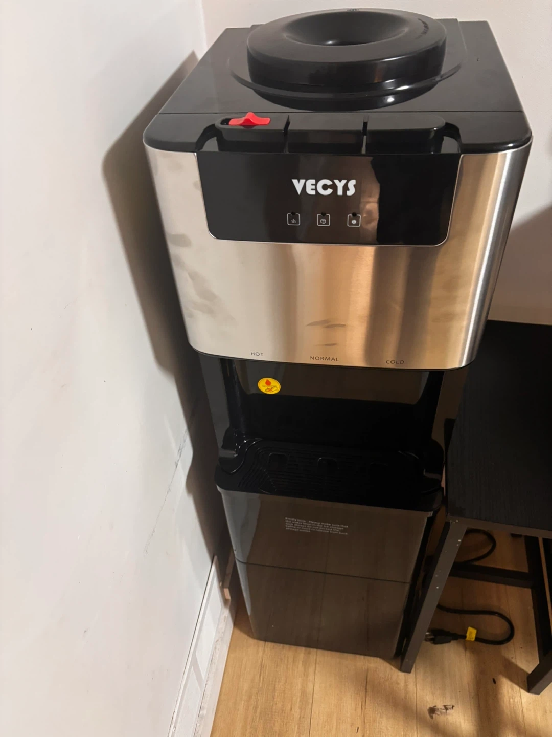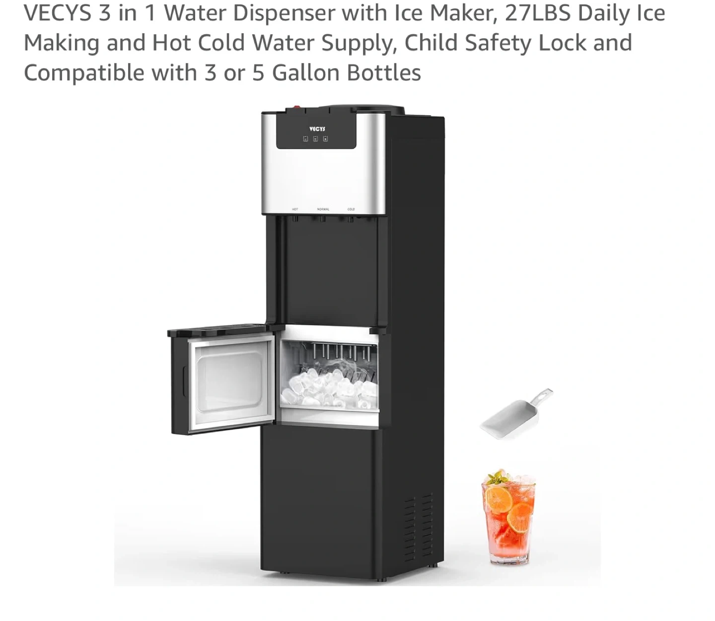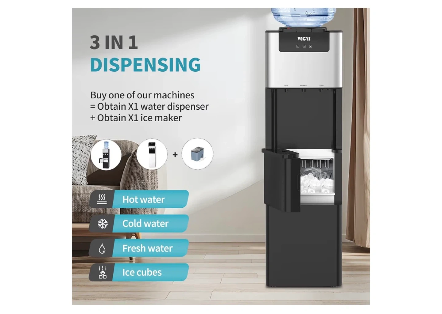 Creates ice cubes in bottom trey while the top gives you ice cold water aswell as hot water