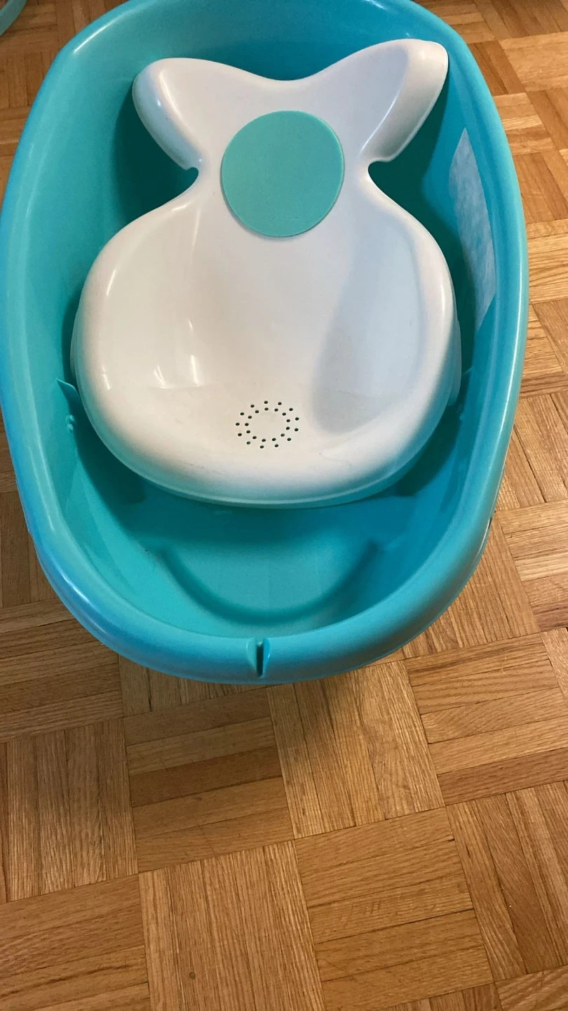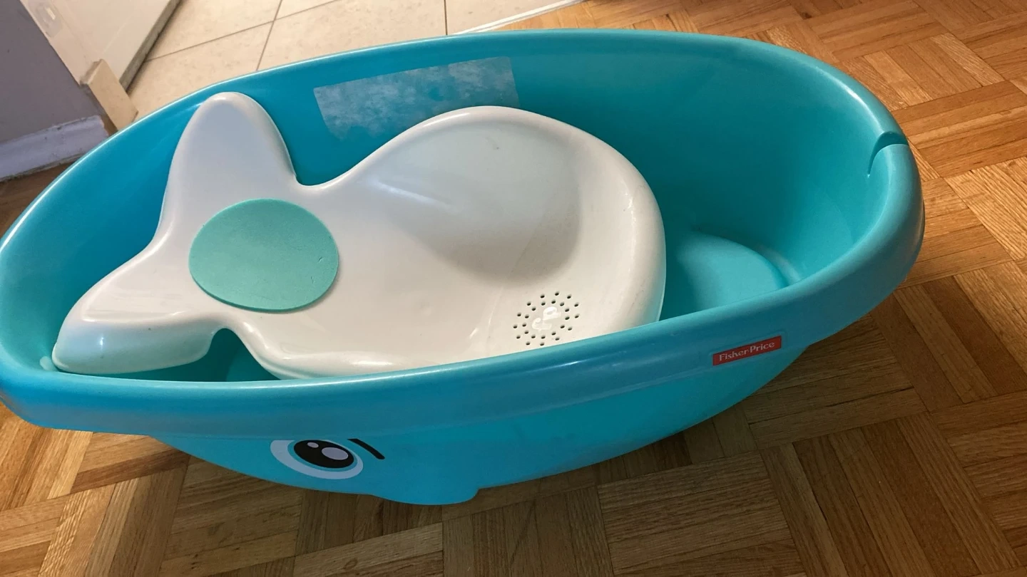 This Fisher-Price baby bath tub is a teal colour with a white insert. It has a cute whale design on the front. The insert features a non-slip surface.