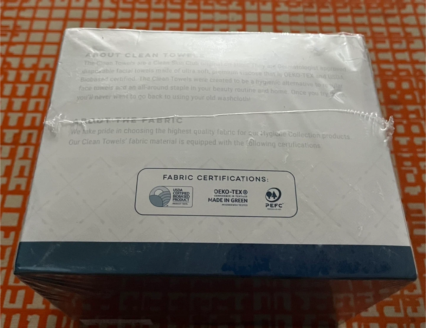 Brand new, sealed box of Clean Skin Club Clean Towels XL. These are ultra-soft, 100% USDA bio-based, and clinically tested. Made from premium viscose that's OEKO-TEX and USDA Bio-based certified, they're a hygienic alternative to washcloths.
