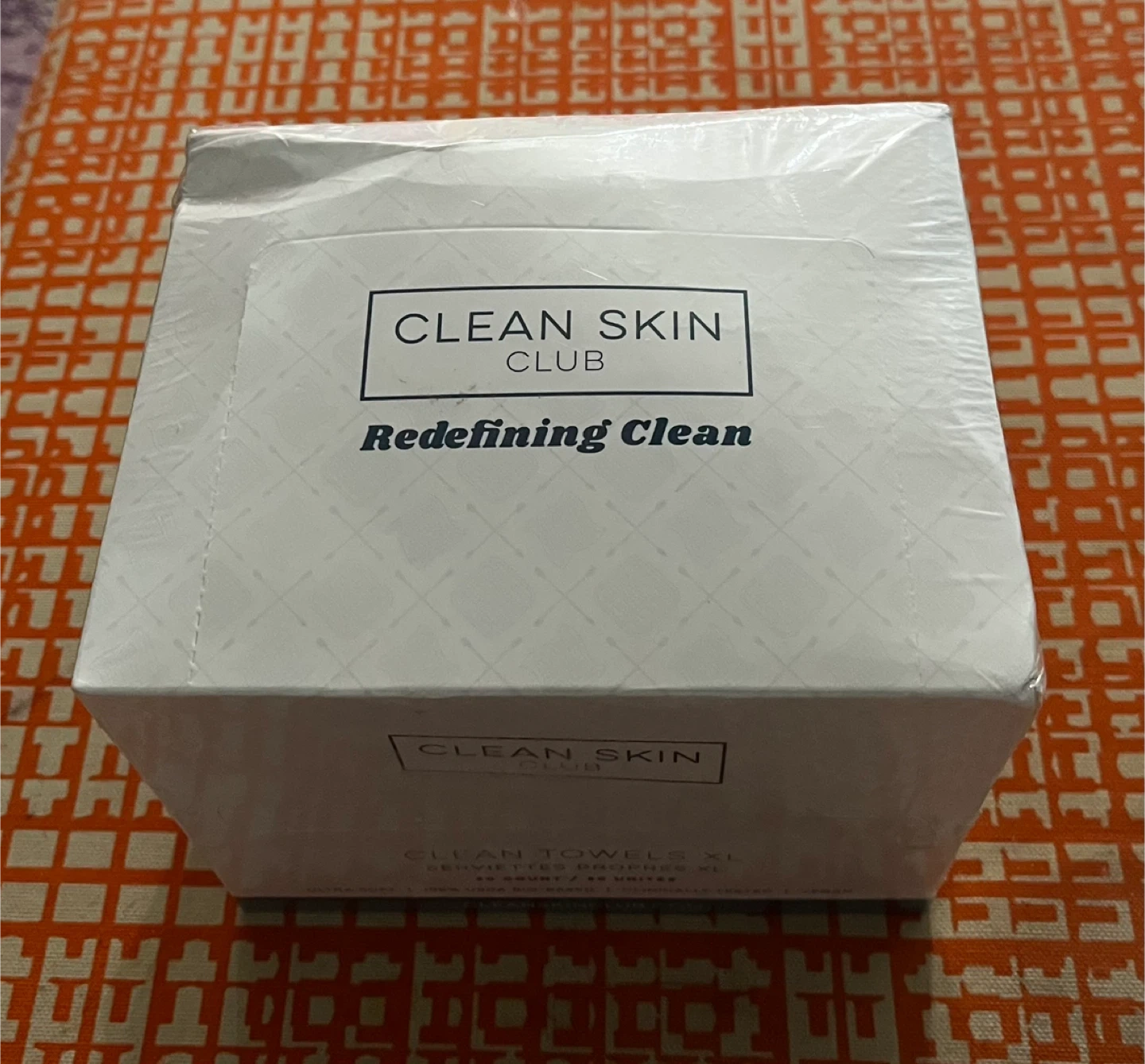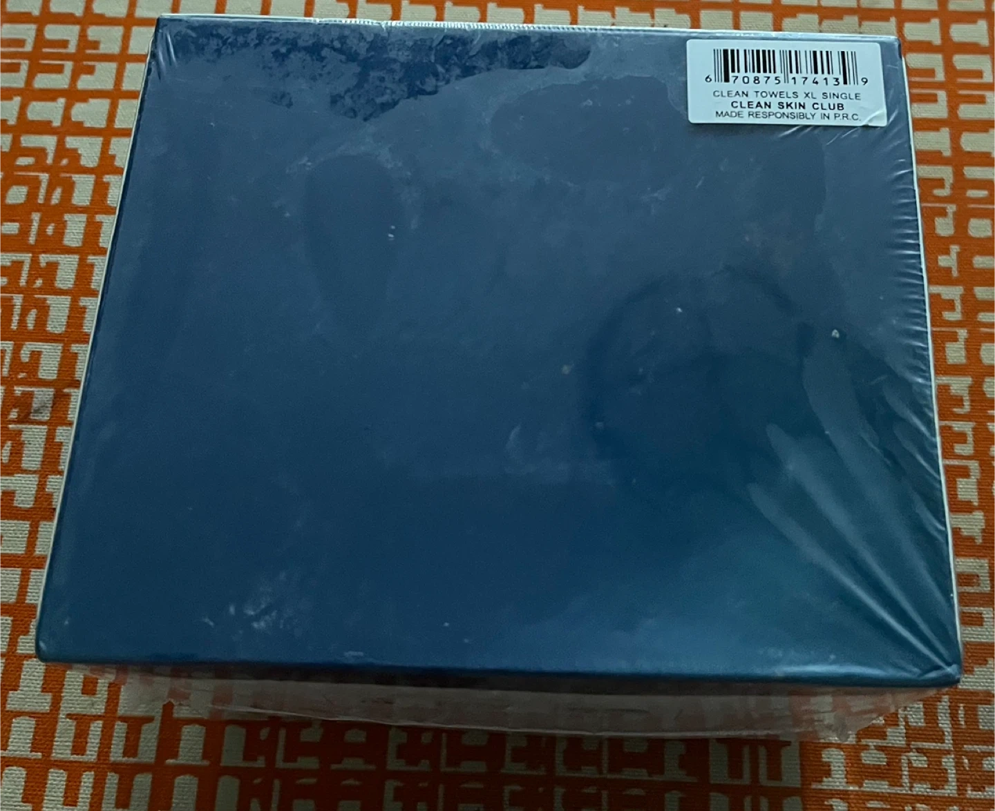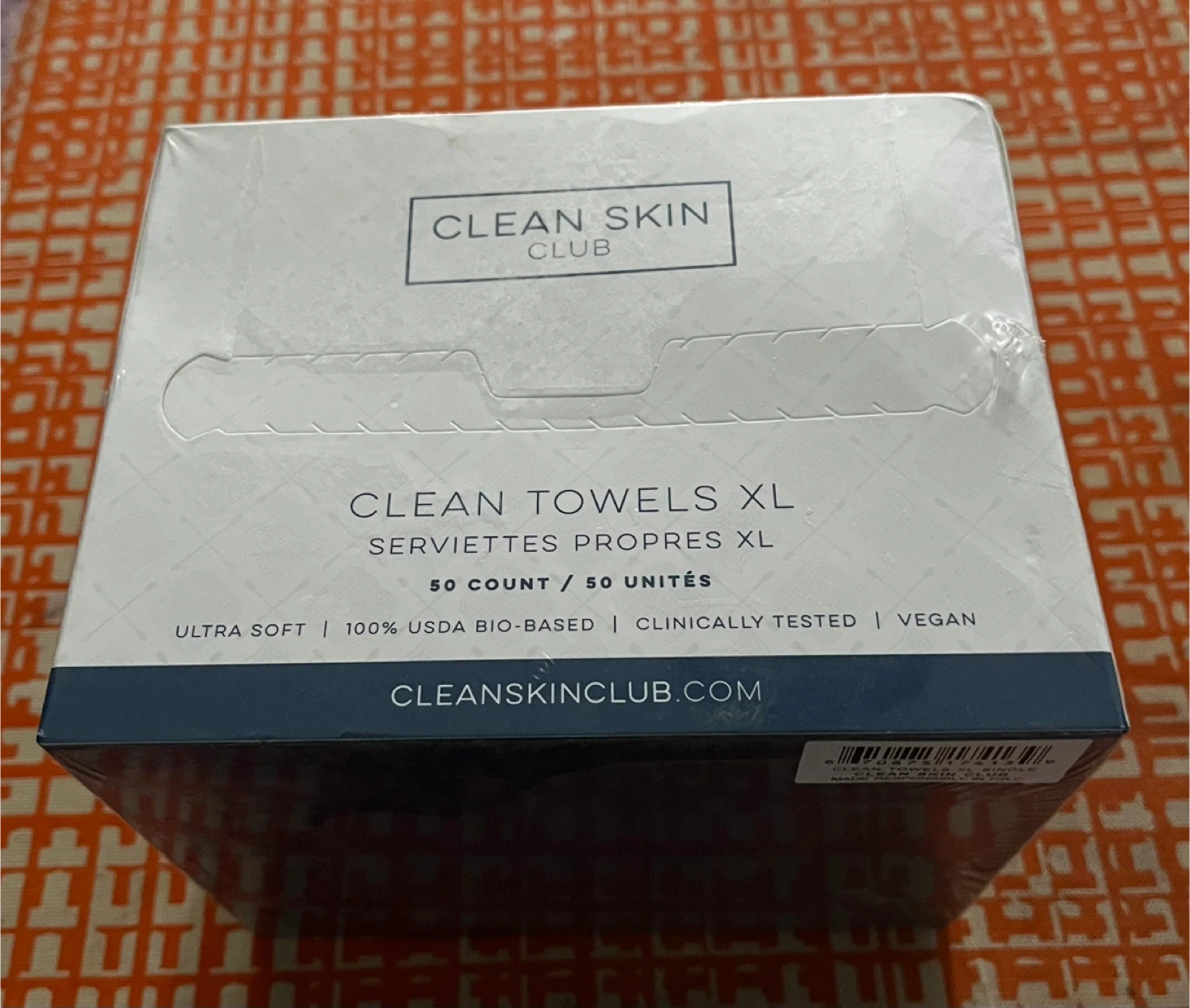 Brand new, sealed box of Clean Skin Club Clean Towels XL. These are ultra-soft, 100% USDA bio-based, and clinically tested. Made from premium viscose that's OEKO-TEX and USDA Bio-based certified, they're a hygienic alternative to washcloths.