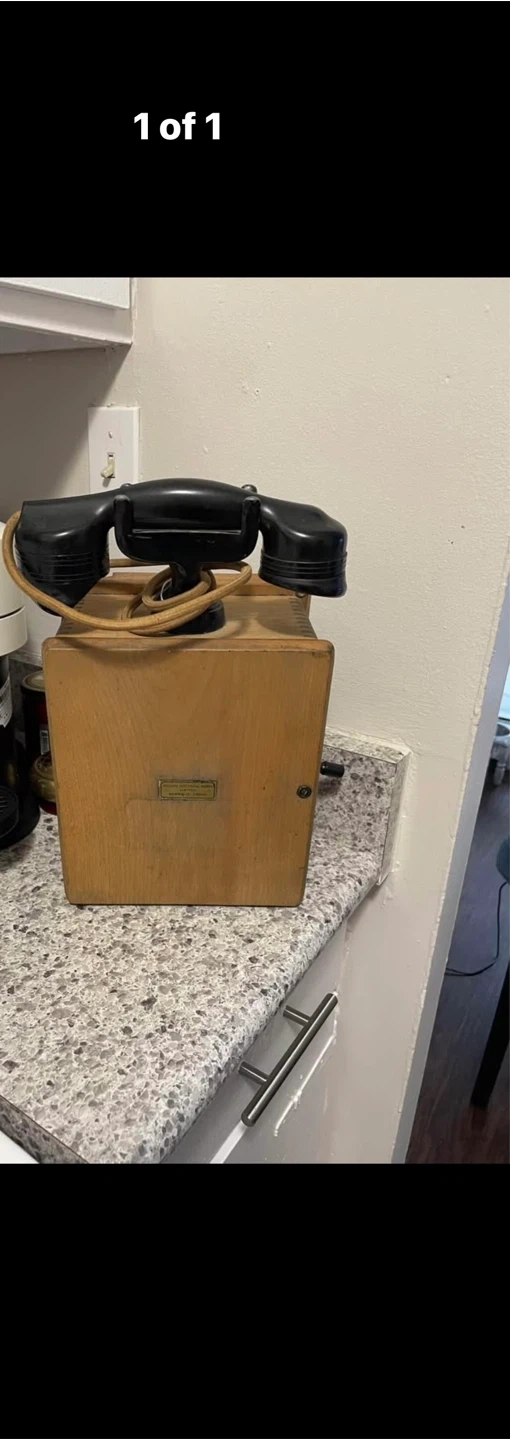 This is a vintage wall-mounted phone with a wooden base. It features a black handset and coiled cord. It's a classic piece for any collector!