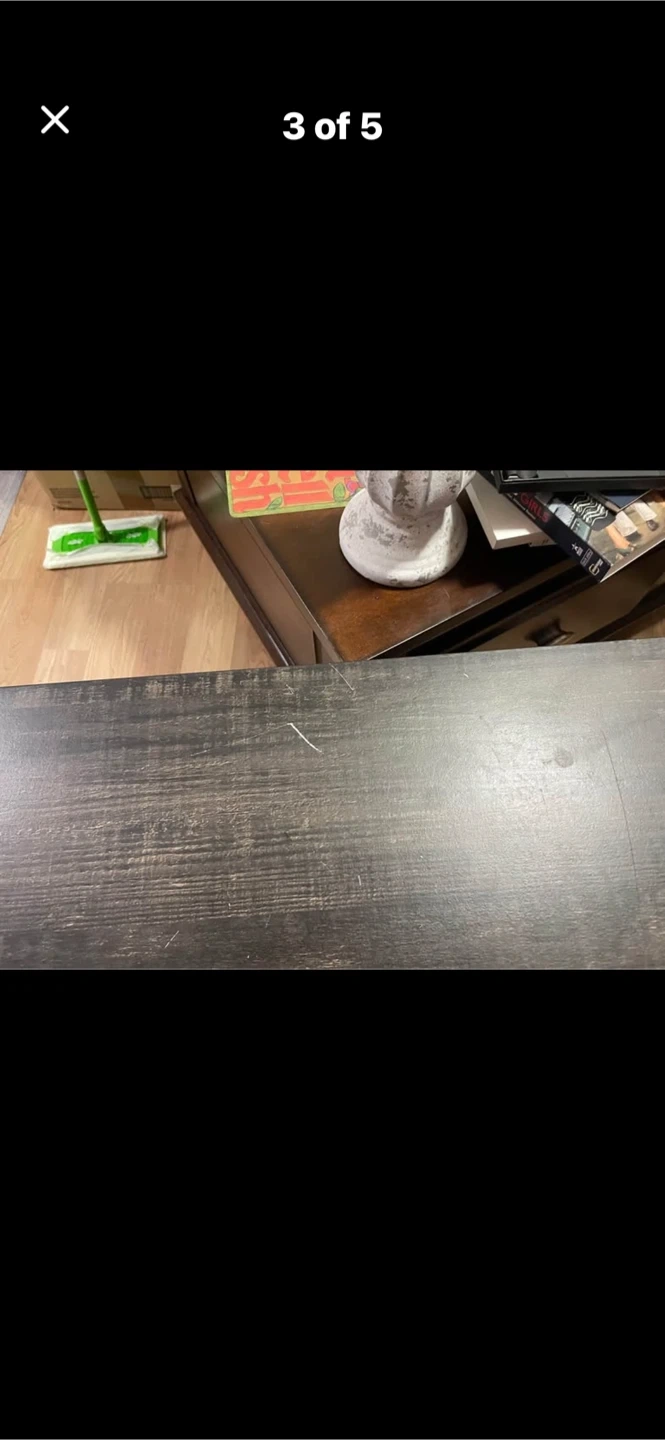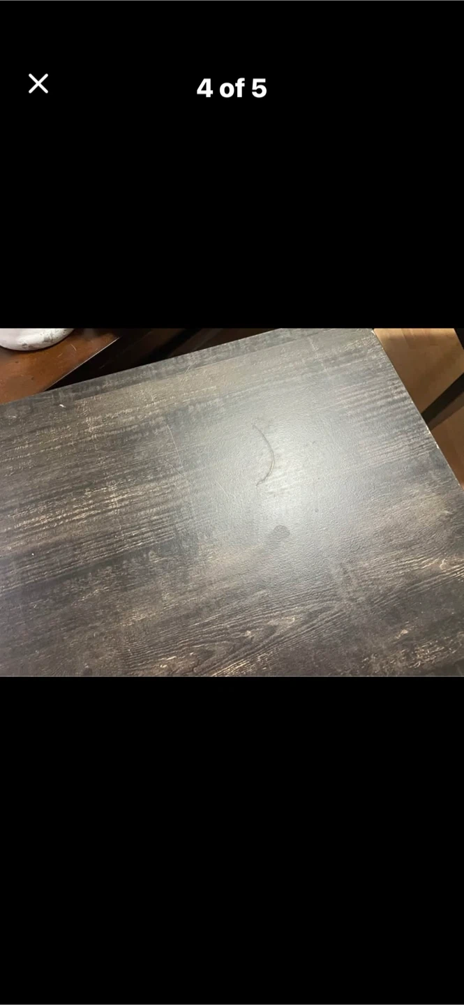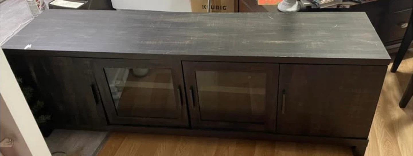 This dark wood media console features a rustic, distressed finish. It has four doors, two with glass panels, providing ample storage. It's perfect for organizing your entertainment centre.