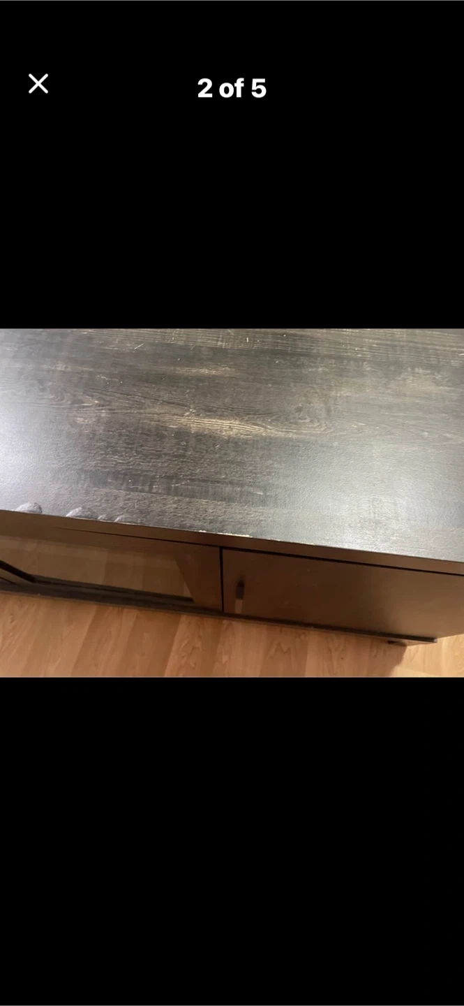 This dark wood media console features a rustic, distressed finish. It has four doors, two with glass panels, providing ample storage. It's perfect for organizing your entertainment centre.
