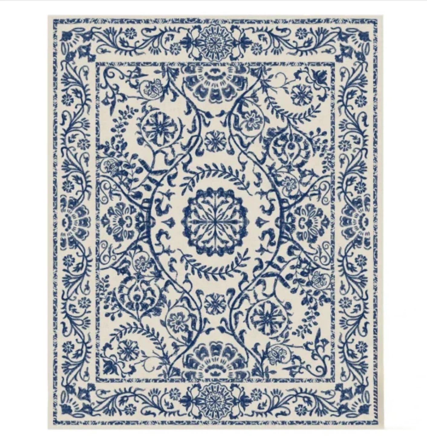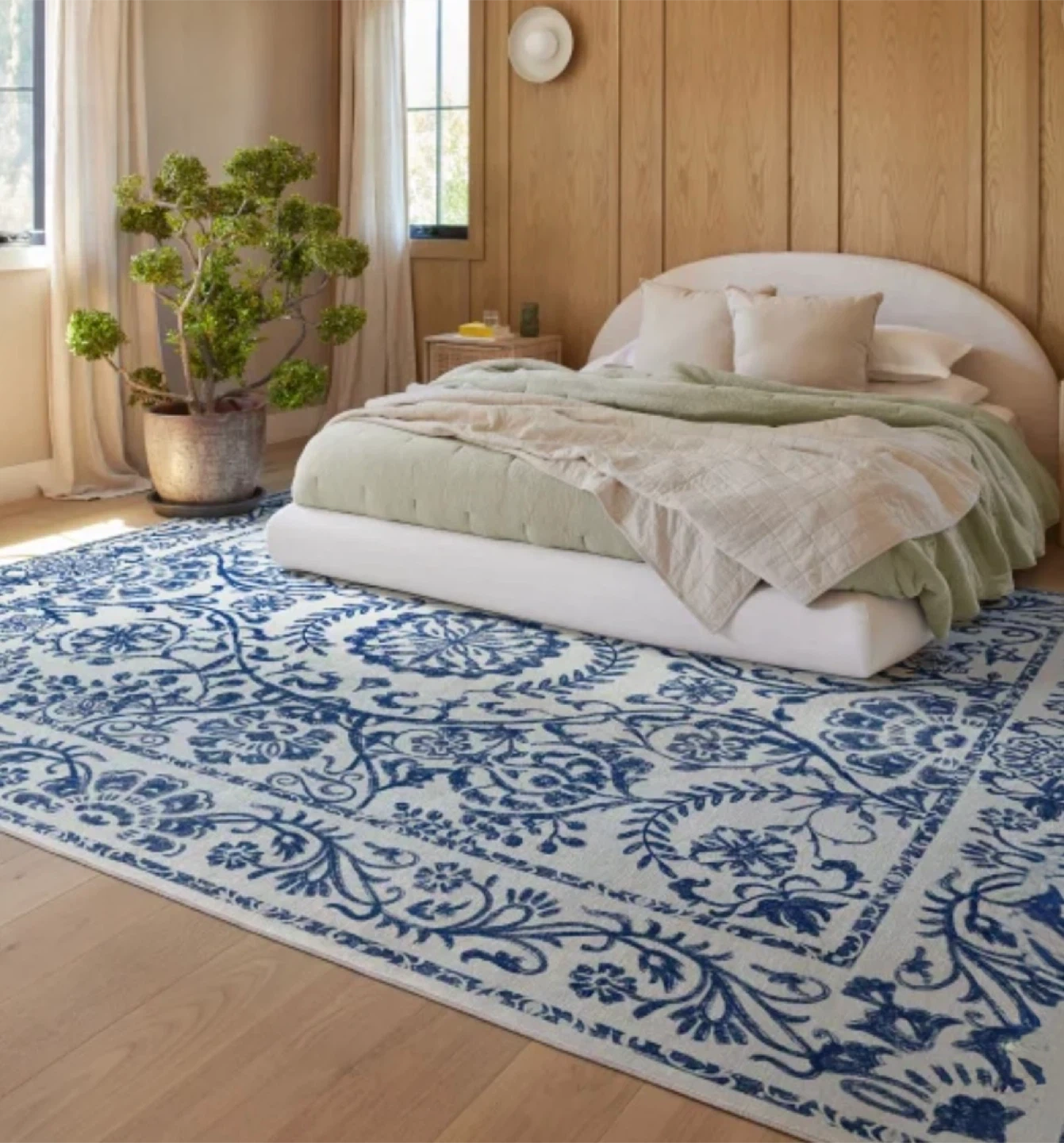 Ruggable washable rug featuring a blue floral damask pattern. It's 8ft x 10ft and includes a non-slip rug pad. This rug is stain-resistant for easy care. It's machine washable, making upkeep a breeze!