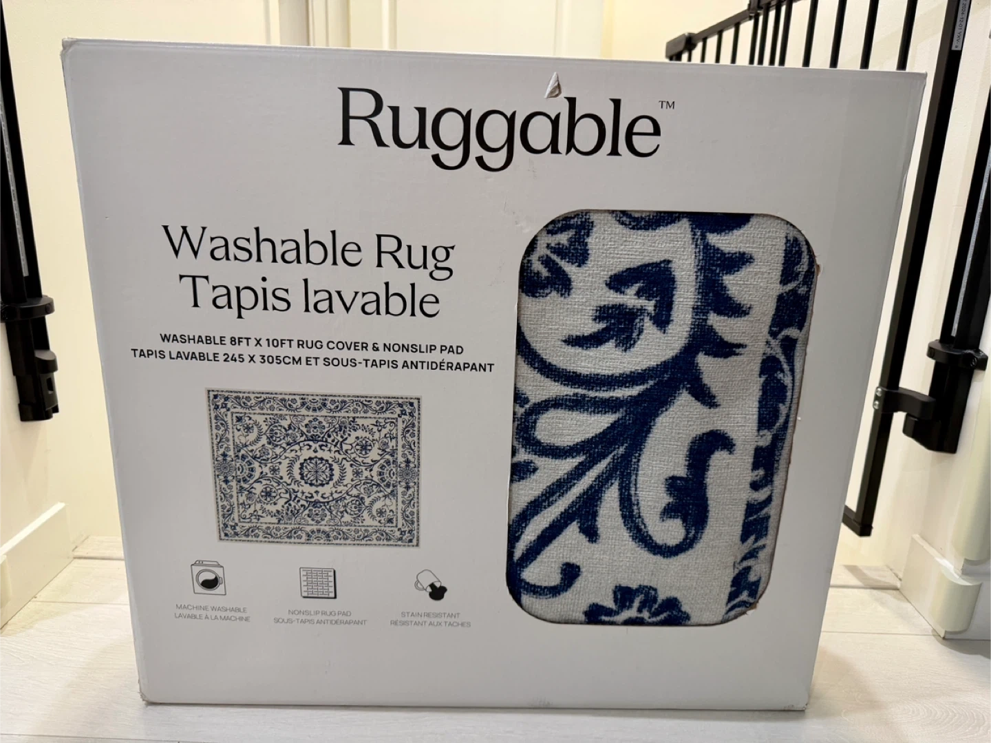 Ruggable washable rug featuring a blue floral damask pattern. It's 8ft x 10ft and includes a non-slip rug pad. This rug is stain-resistant for easy care. It's machine washable, making upkeep a breeze!