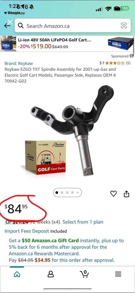 Roykaw EZGO TXT Spindle Assembly for 2001-up Gas and Electric Golf Cart Models, Passenger Side. Replaces OEM #70942-G02. Online new costs $85. Selling for only $40.