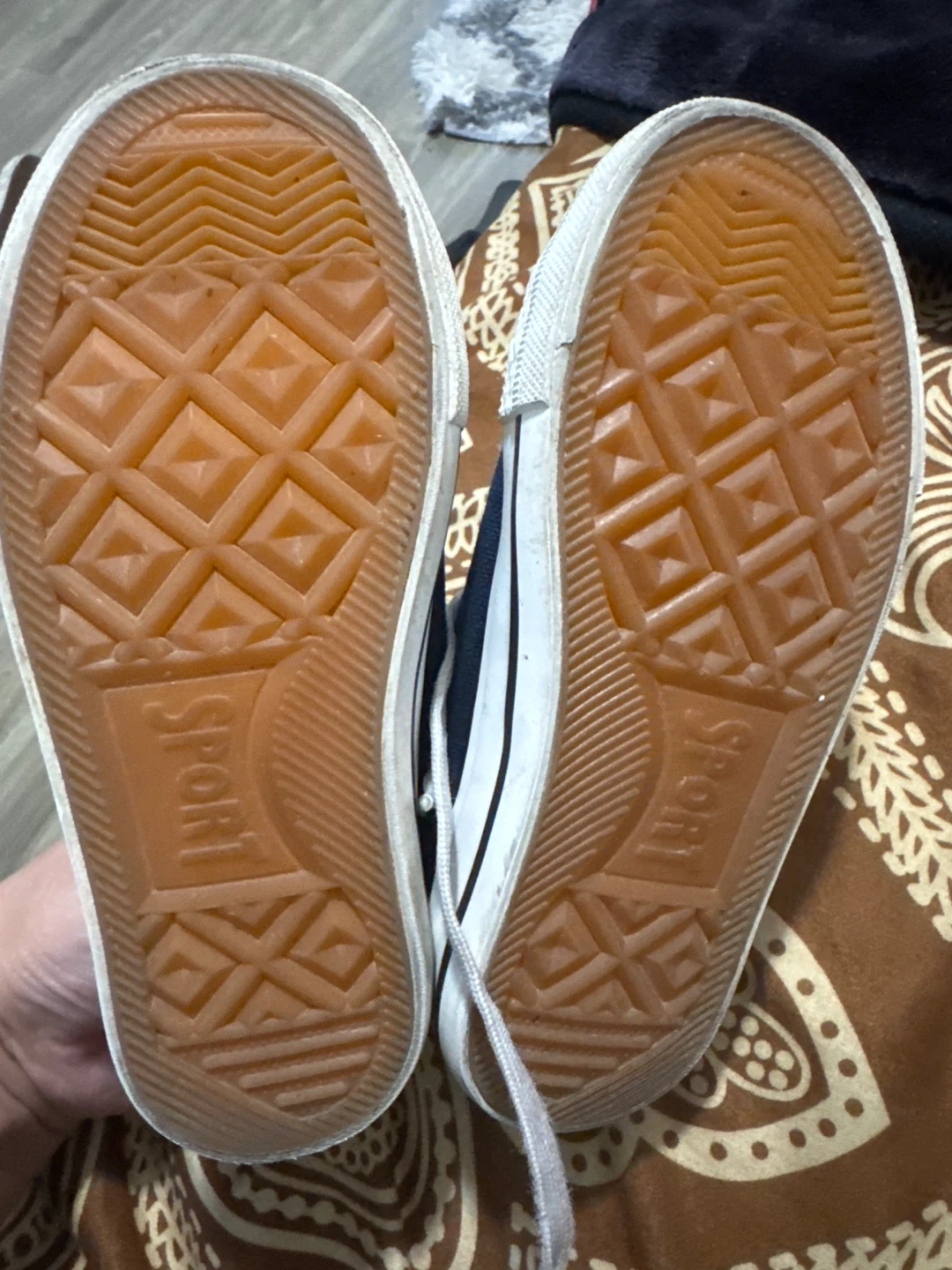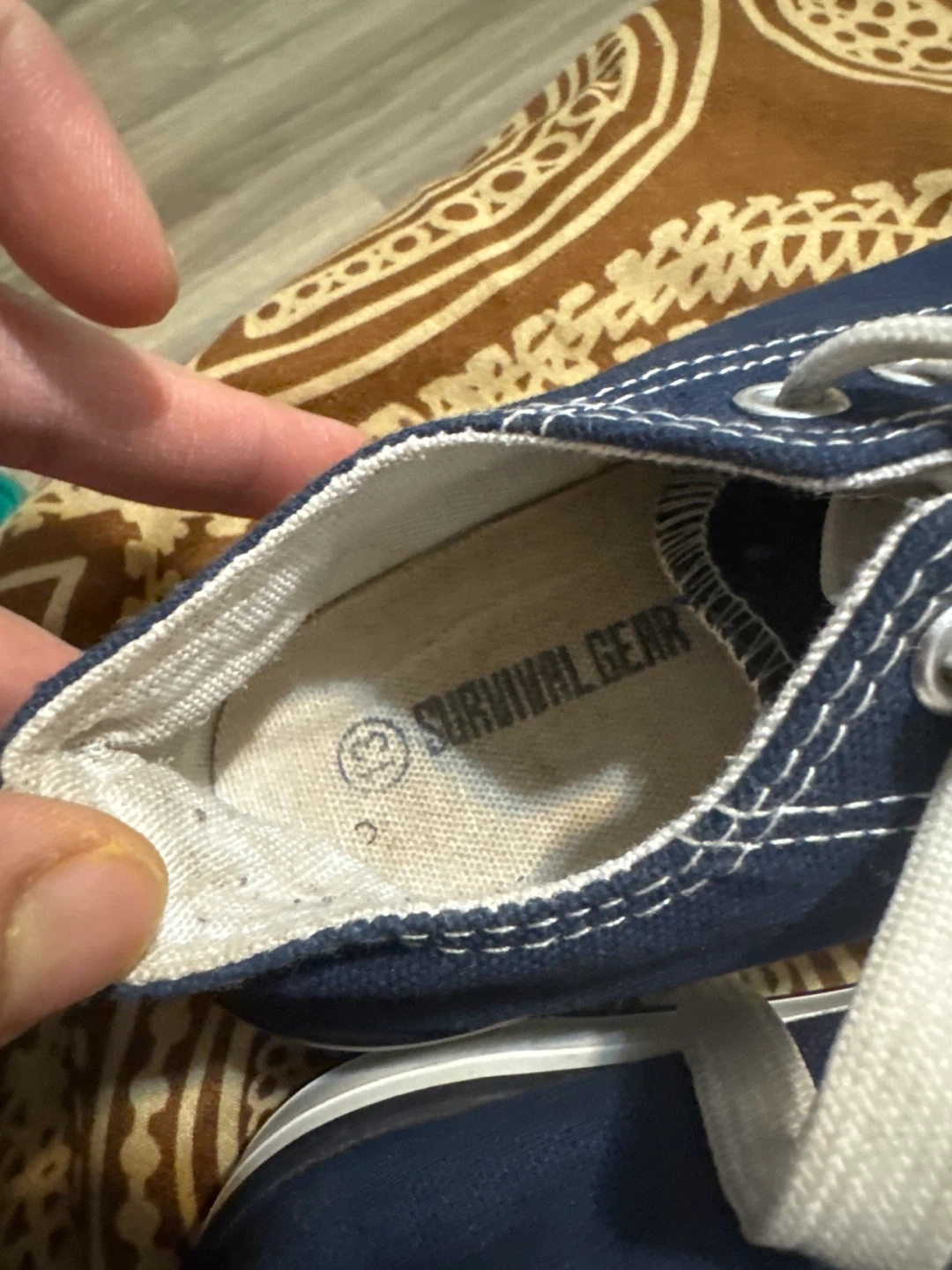 Blue canvas sneakers with white laces. Features white rubber toe caps and soles with "Sport" branding. The interior shows "Survival Gear" and size 13